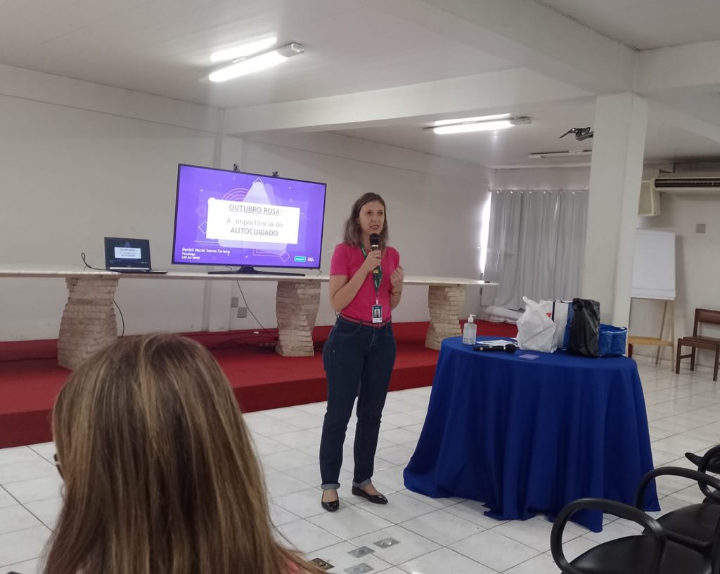 Seguindo com a palestra, a enfermeira Jackeline reforçou a importância do autoexame constante e diário. Aproximadamente 80% das mulheres descobrem o câncer de mama através do toque. Ele é ideal para que o público feminino conheça o próprio corpo detalhadamente.