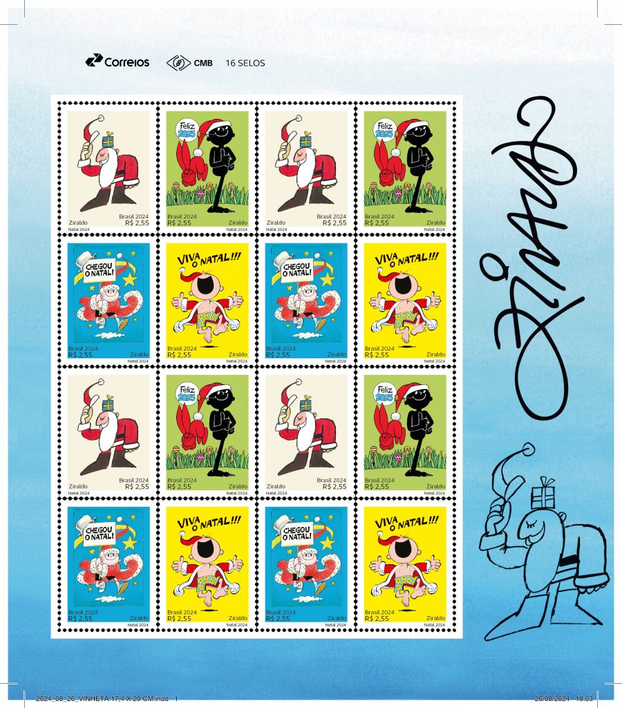 Cada selo traz uma parte do legado visual de Ziraldo. O primeiro apresenta um Papai Noel desenhado nos anos 1970, que o próprio artista descreveu como sua versão favorita do personagem. Outro destaque é a capa da revista “A Turma do Pererê”, de 1975, adaptada para o Natal de 2024. A coleção também inclui uma ilustração do Menino Maluquinho, feita a lápis de cor no final dos anos 1990, e um desenho criado para a 41ª Feira da Providência, de 2001.