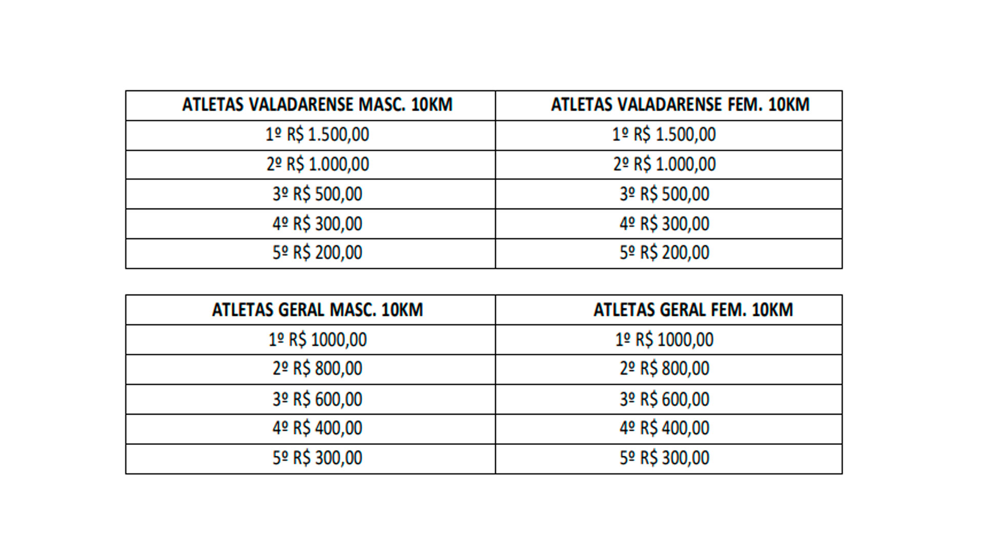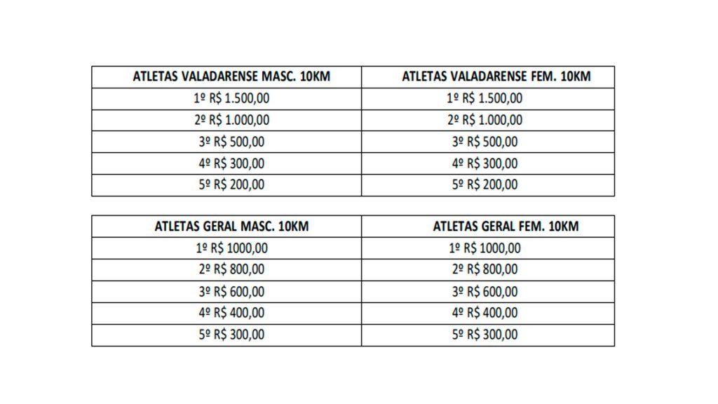 De acordo com a organização do evento, ao todo as premiações somam R$ 20 mil. O maior valor do prêmio individual é de R$ 1.500 para o corredor que ficar no 1º lugar do pódio no percurso de 10 km.