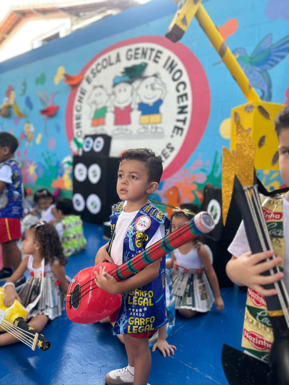 A participação das famílias também foi essencial. Pelo projeto “Mãos Inventoras”, responsáveis e crianças confeccionaram instrumentos musicais com materiais recicláveis, que passaram a integrar as aulas de musicalização e apresentações coletivas, fortalecendo o vínculo entre escola e comunidade.