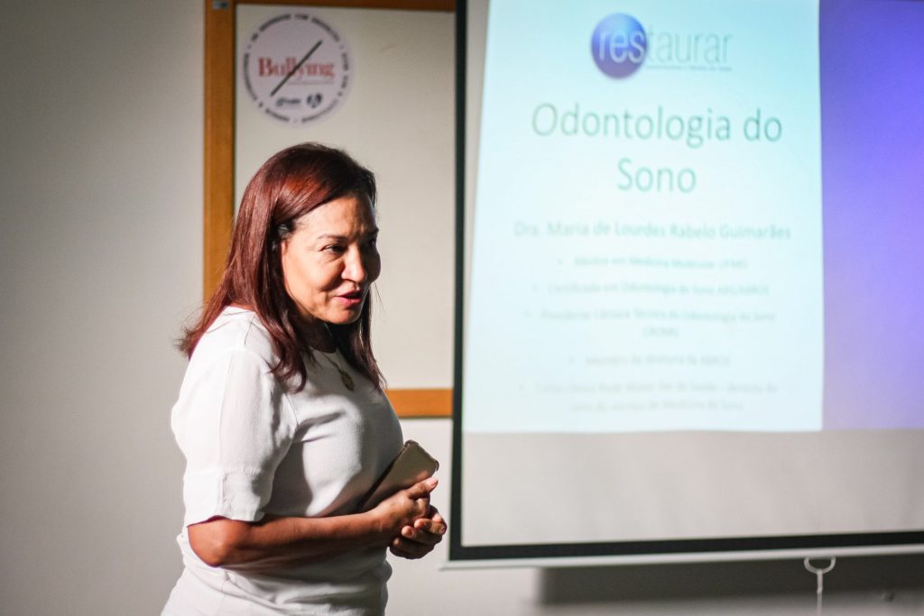 A responsável pela palestra foi a professora Maria de Lourdes Rabelo. Ela comentou que muitos profissionais da área ainda não conhecem esse campo de atuação. “A Odontologia do Sono é uma área da Odontologia que tem características próprias. É uma especialidade que muitos dentistas ainda não sabem o que é, e é uma área em que a gente trabalha em equipes multiprofissionais, com impacto muito grande em nossa atuação”, destacou a palestrante.