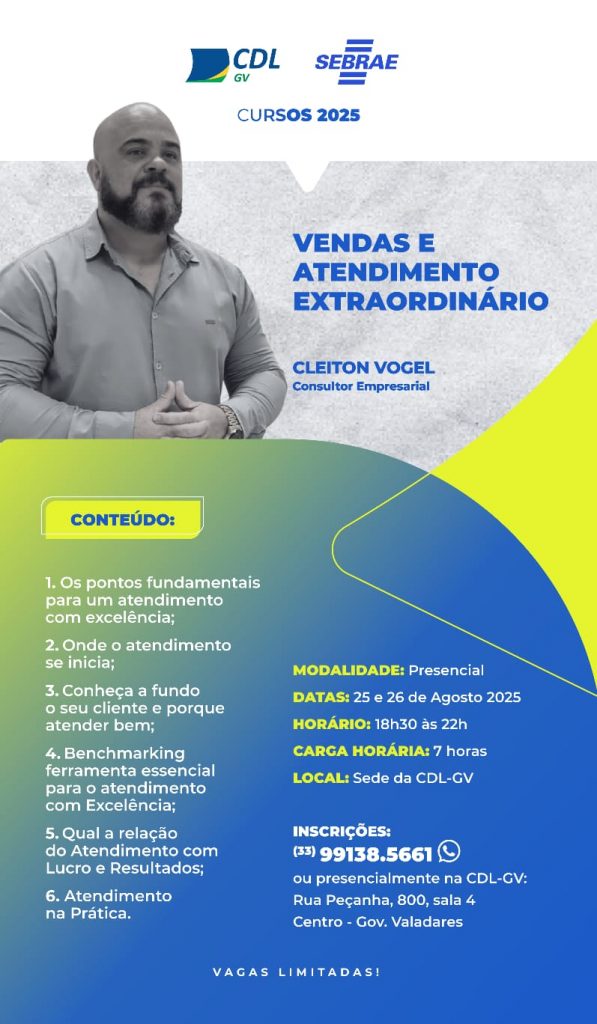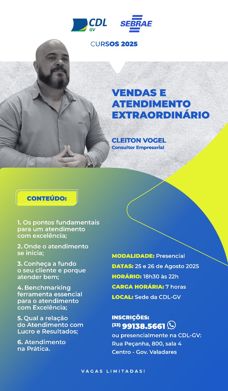 GOVERNADOR VALADARES – Nos dias 25 e 26 de agosto, a Câmara de Dirigentes Lojistas de Governador Valadares (CDL-GV) sediará o curso “Vendas e Atendimento Extraordinário”, com o consultor empresarial Cleiton Vogel, voltado para quem deseja aprimorar habilidades de atendimento e impulsionar os resultados do negócio.