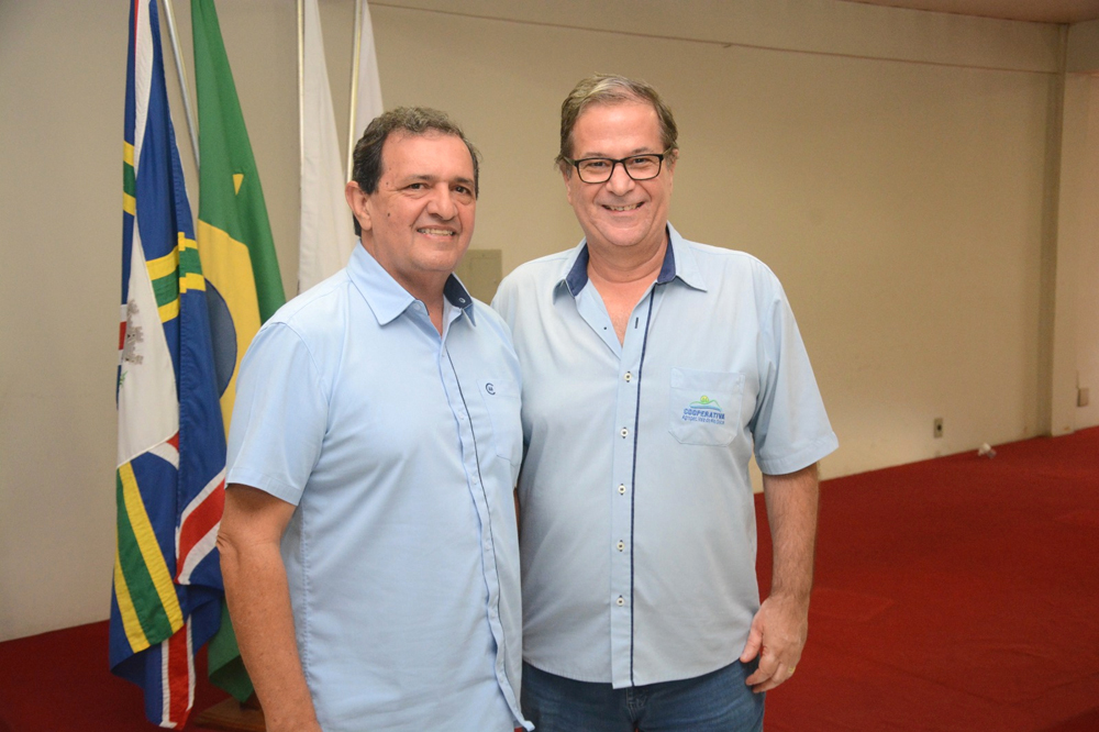O presidente da Cooperativa, João Marques Pereira, ao lado do gerente de Política Leiteira, o engenheiro-agrônomo Alexandre Negri Leão Coelho. Os dois participaram da apresentação dos resultados do programa de Assistência Técnica e Gerencial (ATeG) no Leste de Minas. Evento realizado pela Federação da Agricultura e Pecuária do Estado de Minas Gerais.