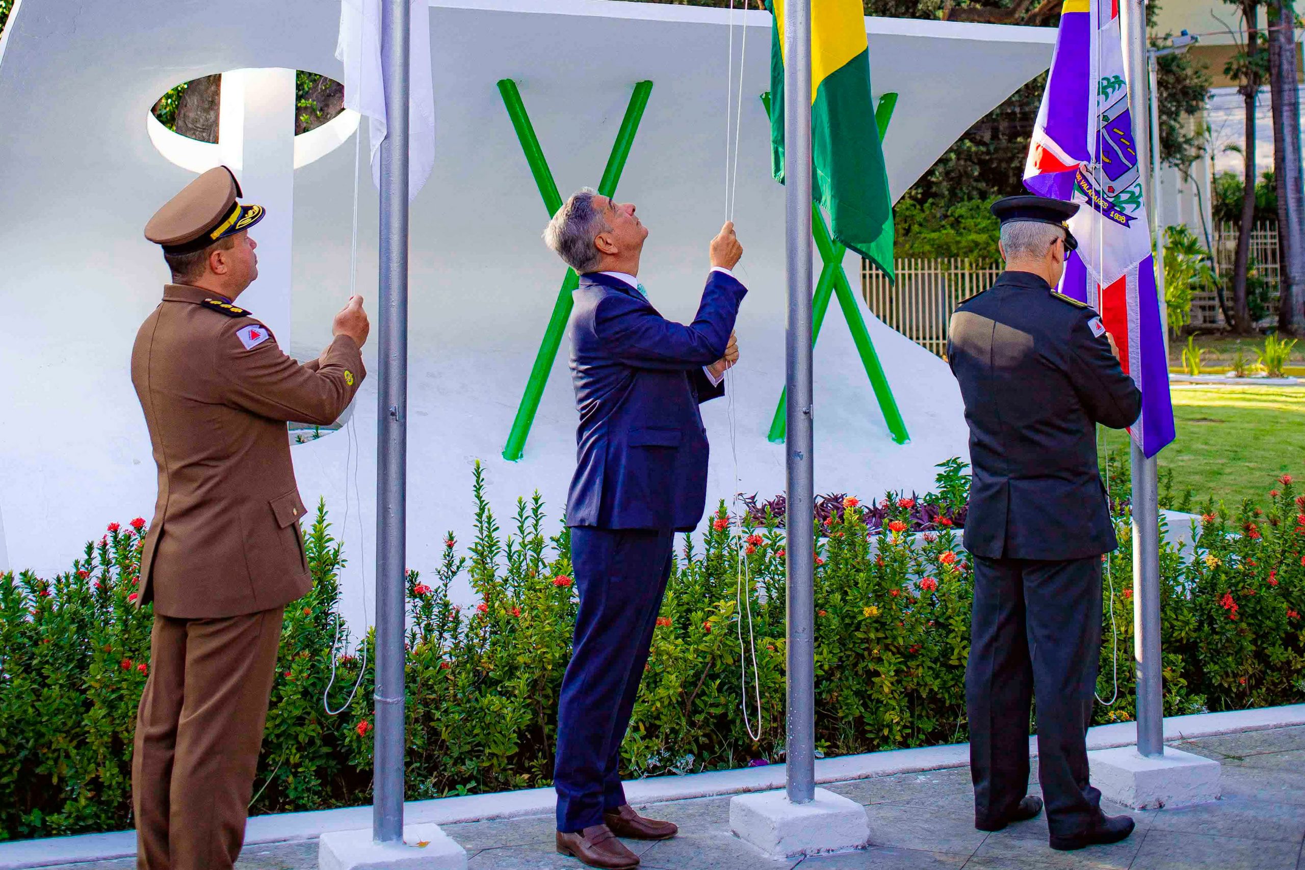 A solenidade começou com o hasteamento das bandeiras pelo prefeito e por comandantes da Polícia Militar e do Corpo de Bombeiros. Em seguida, ocorreu a revista de tropa, prática militar que simboliza respeito e confiança nas corporações.