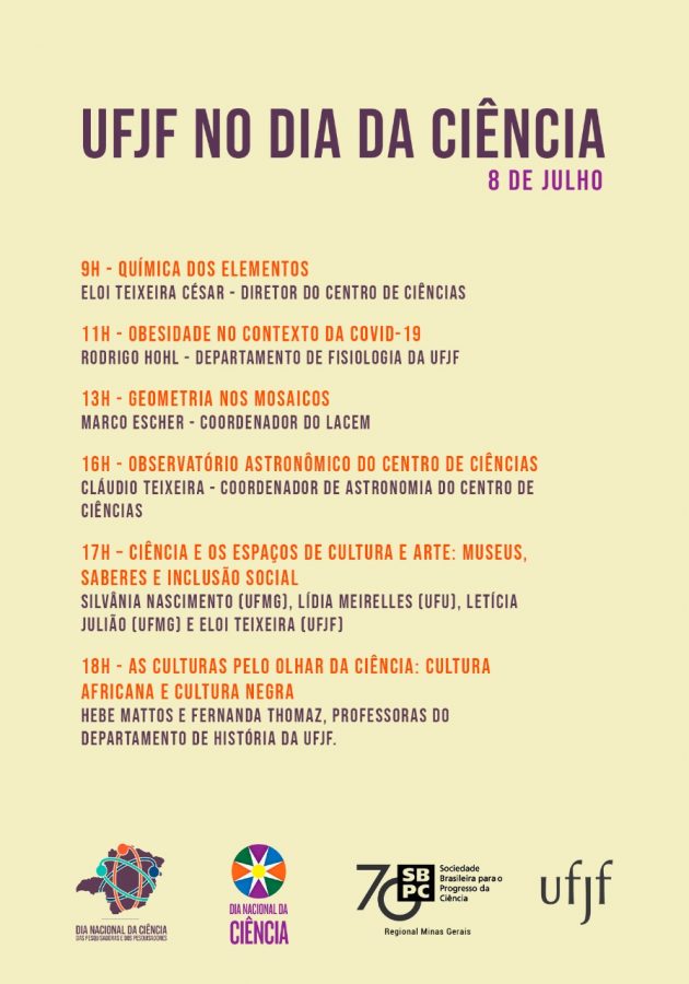 O evento começou às 9h com a exibição do vídeo “Química dos Elementos”, por Elói Teixeira ; às 11h, foi exibido o vídeo “Obesidade no contexto da Covid-19”, por Rodrigo Hohl, do Departamento de Fisiologia da UFJF; às 13h, será a hora da “Geometria nos Mosaicos”, por Marco Escher, Coordenador do Laboratório de Ciências e Educação Matemática (LaCEM); e às 15h, “Observatório Astronômico do Centro de Ciências”, por Cláudio Teixeira, Coordenador de Astronomia do Centro de Ciências.