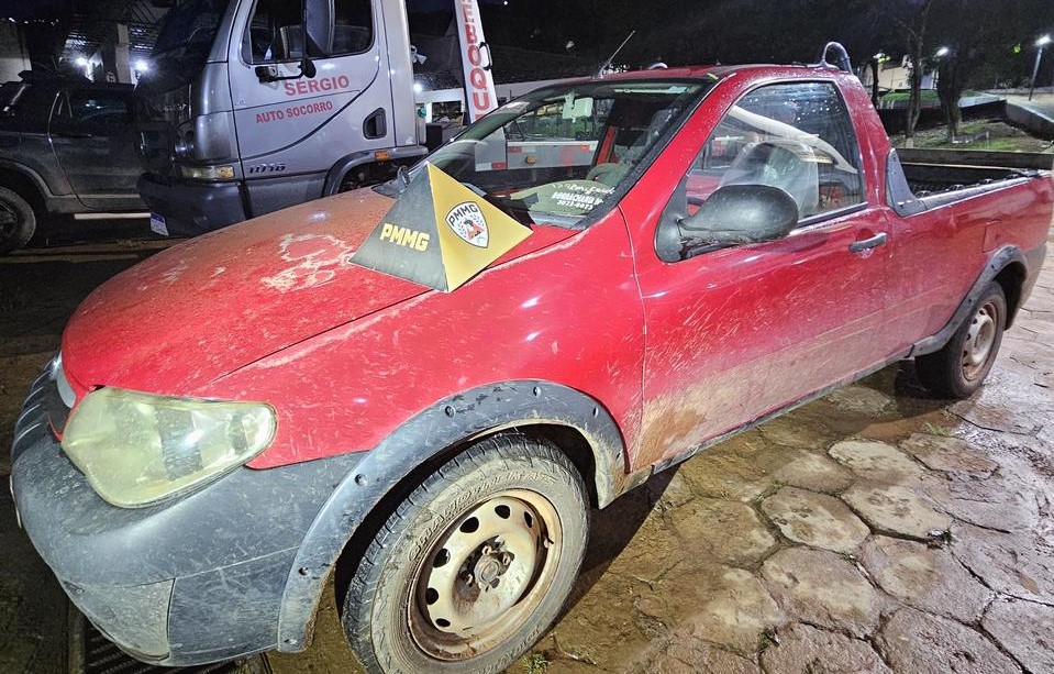 Durante as diligências, os policiais localizaram uma Fiat Strada com indícios de adulteração nos sinais identificadores. Na vistoria, os militares constataram fraude nos elementos de identificação, o que impediu a confirmação imediata da procedência do automóvel.