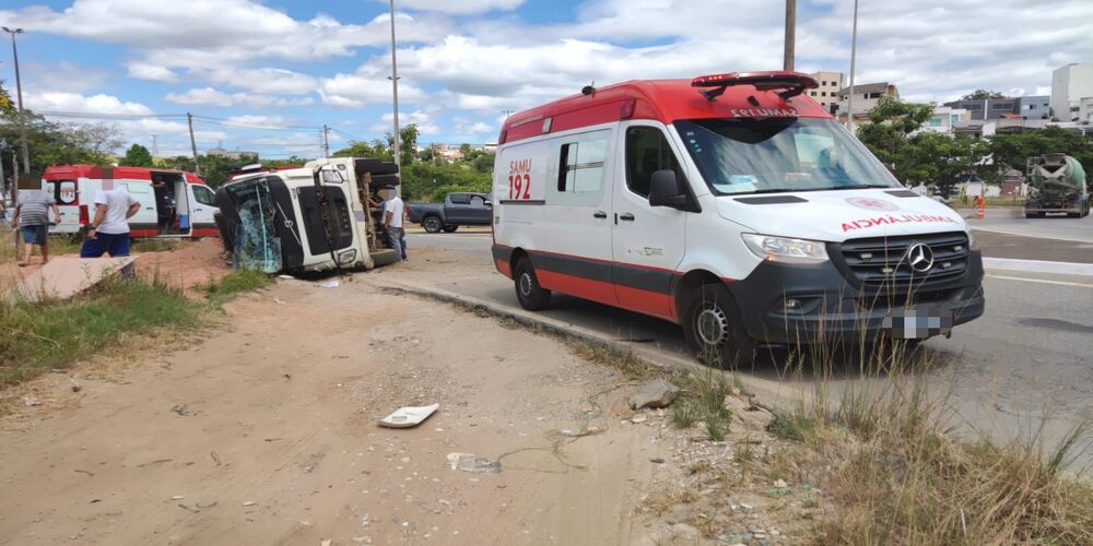 Segundo informações, um caminhão carregado de cascalho tombou no momento em que passava pela rotatória. O motorista e o ajudante ficaram feridos. Equipes do Serviço de Atendimento Móvel de Urgência (Samu-192) socorreram os dois.