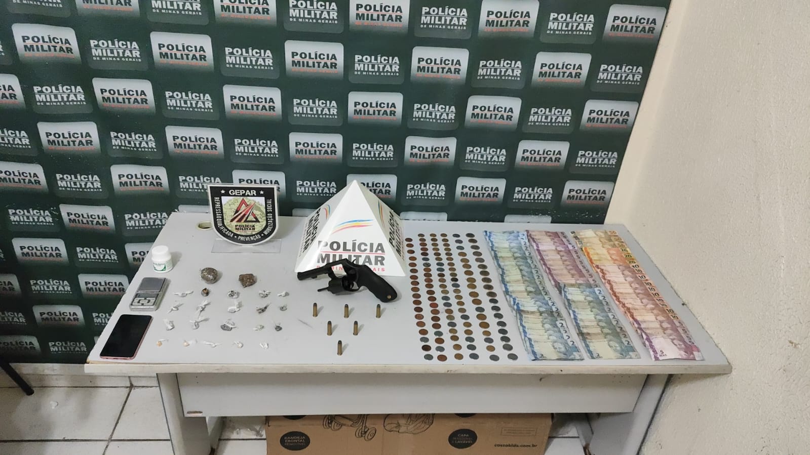 Os policiais foram até o local e abordaram a residência. Após terem a entrada permitida pelo morador, os militares realizaram uma busca no interior do imóvel e encontraram: