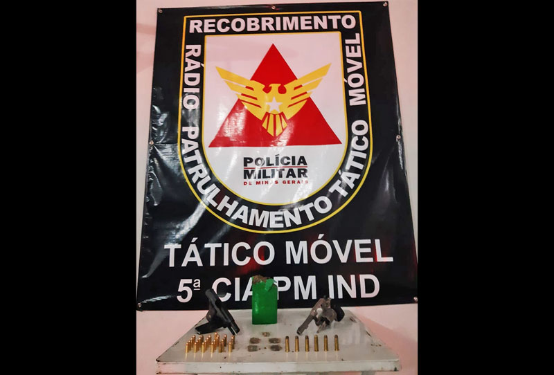 Em seguida, após buscas, os militares encontraram um revólver, uma pistola, 2 munições intactas, além de 5 buchas e um tablete de maconha.