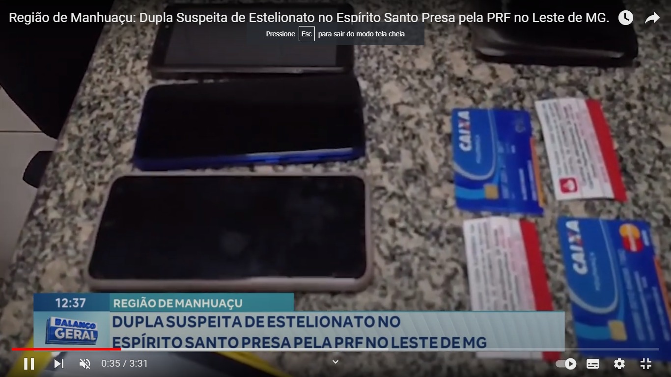 MANHUAÇU – A Polícia Rodoviária Federal (PRF) prendeu dois homens, na BR-262, em Manhuaçu, suspeitos de aplicar golpes em agências bancárias no Espírito Santo. Com a dupla, a polícia apreendeu dinheiro e cartões bancários. De acordo com a PRF, o material seria das vítimas. A dupla possui extensa ficha criminal por roubo, homicídio e, principalmente, por estelionato. Um deles, inclusive, usava tornozeleira eletrônica. Acompanhe a reportagem completa da TV Leste.