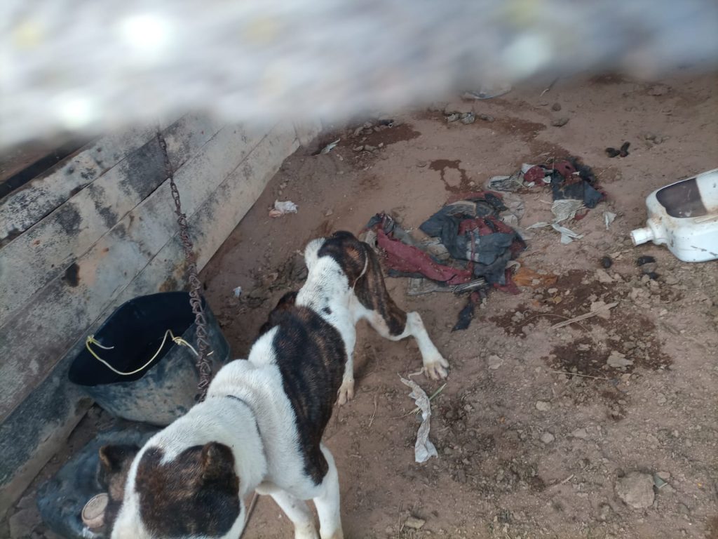Na sequência, a equipe relata que avistou uma casa de madeira e foi verificar. Ao se aproximar do ambiente, a polícia se deparou com uma cena lamentável: um cachorro da raça Pitbull, aparentemente debilitado. Segundo a Polícia Civil, o animal estava extremamente magro, exausto e com “bicheira” em um dos lados do corpo. Ainda conforme relato dos investigadores, o cachorro não tinha forças para sustentar o próprio corpo, exalava odor, não tinha alimento próximo ao cão e nas fezes do animal continha plástico. A PC também diz que reconheceu o Pitbull como sendo de um dos procurados, mas não localizou o homem.