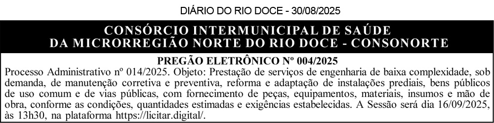 PROCESSO LICITATÓRIO Nº 104/2025 – PREGÃO ELETRÔNICO Nº 14/2025. Objeto: Registro de Preço para eventual e futura aquisição de Eletrodomésticos e Equipamentos em atendimento a Secretaria Municipal de Saúde de Galileia-MG. Início de Recebimento das Propostas: 14/08/2025, às 08h00min. Fim do Recebimento das Propostas: 26/08/2025, às 08h00min. Data da Sessão Eletrônica: 26/08/2025, às 09h00min. Local: BLL www.bll.org.br. Aquisição do Edital na sede da Prefeitura Municipal de Galiléia, MG, E-mail: licitacao@galileia.mg.gov.br, Site: http://galileia.mg.gov.br/licitacoes/ e Portal Nacional de Compras Públicas (PNCP). Maiores Informações na sede da Prefeitura Municipal de Galiléia-MG, pelo email: licitacao@galileia.mg.gov.br ou pelo telefone: (33) 3244-1221. Galiléia-MG, 11/08/2025. Jonatas Melo Baltar. Secretário Municipal de Administração e Governo.