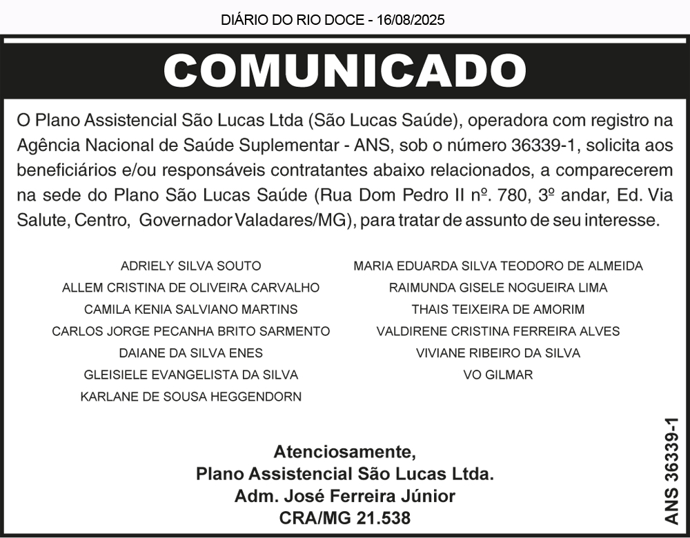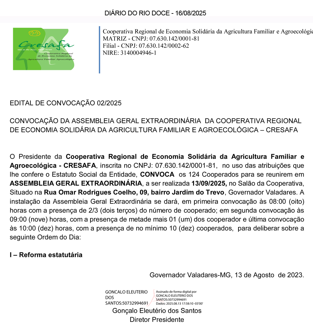 SINDICATO DOS AUXILIARES DE ADMINISTRAÇÃO ESCOLAR DO NORDESTE MINEIRO – SAAENE/MG – CNPJ: 19.647.968/0001-32 – Eleições Sindicais – Registro de Chapa. Em cumprimento ao disposto no § 1º do artigo 53 do Estatuto do SAAENE/MG, comunico que foi registrada a seguinte chapa única como concorrente às eleições a que se refere o aviso publicado nos jornais Diário do Aço – página: 04, Diário de Caratinga – página: 07, Diário de Teófilo Otoni – página: 06 e Diário do Rio Doce – página: 15, em sua edição do dia 27 (vinte e sete) de julho de 2025 (dois mil e vinte e cinco). Diretoria Geral: Angelo Lacerda Rocha – Presidente, Deyller Moura Silva de Paula – Diretor Tesoureiro, Elane ALves de Carvalho – Diretor Representante no Município de Teófilo Otoni e Região, Hamilton Ricardo Nogueira – Diretor Representante no Vale do Aço, Ilmar Neves de Paula – Diretor Representante no Município de Governador Valadares e Região, Jorge Eduardo Ferreira Medina – Secretário Geral, Marcia Maria da Silva Martins – Diretor Representante no Município de Caratinga e Região. Conselho Fiscal: Alberto Celso Xavier Pereira, Conceição Ferreira da Silva Martins e Elzira Maria Pereira. Nos termos do § 1º do artigo 54 e do artigo 28, inciso X, do Estatuto, declaro que eventual impugnação de candidaturas poderá ser apresentada nos dias 08, 09 e 10 do mês de agosto de 2025, no horário de funcionamento da Secretaria do Sindicato. Governador Valadares, 07 de agosto de 2025 – Angelo Lacerda Rocha – Presidente do Sindicato e do Processo Eleitoral.