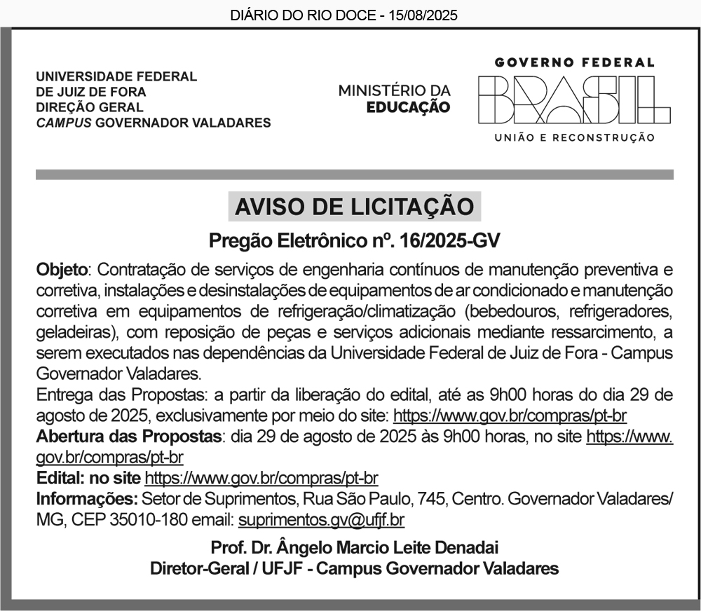 O Município de Governador Valadares, torna público O AVISO DE LICITAÇÃO CONCORRÊNCIA ELETRÔNICA Nº 005/2025 – P.A.C. N° 286/2025, critério de julgamento “MENOR PREÇO”, sob o regime de EXECUÇÃO DE EMPREITADA POR PREÇO GLOBAL, cujo objeto é a Contratação de empresa especializada na área de engenharia para a execução de obras de Construção de uma Unidade de Atenção Especializada (Policlínica) de porte único, localizada na Av. Travessa Coqueiral, s/n, no Bairro Turmalina, no Município de Governador Valadares, Estado de Minas Gerais., conforme condições, quantidades e exigências estabelecidas neste Edital e seus anexos, através da liberação de recursos do Novo Programa de Aceleração do Crescimento (PAC), Termo de Compromisso 960709/2024/MS/CAIXA – OPERAÇÃO 1094937-67 e recurso próprio, cujo edital encontra-se à disposição dos interessados, para exame e aquisição, através dos sites www.gov.br/compras e https://www.valadares.mg.gov.br/licitacoes. O RECEBIMENTO DAS PROPOSTAS DAR-SE-Á: até às 09:00 do dia 22 de setembro de 2025. O INÍCIO DA SESSÃO DE DISPUTA DE PREÇOS COM ANÁLISE DAS PROPOSTAS: a partir das 09:00hs do dia 22 de setembro de 2025, com os representantes das licitantes devidamente credenciados e quantos interessarem. – Wilson Gomes da Silva Junior – Secretário Municipal de Administração.
