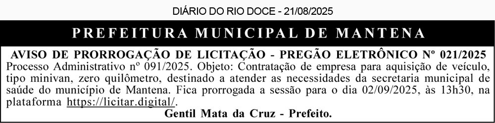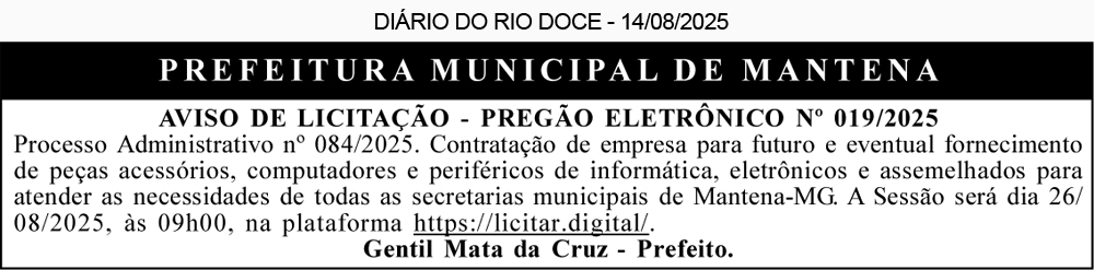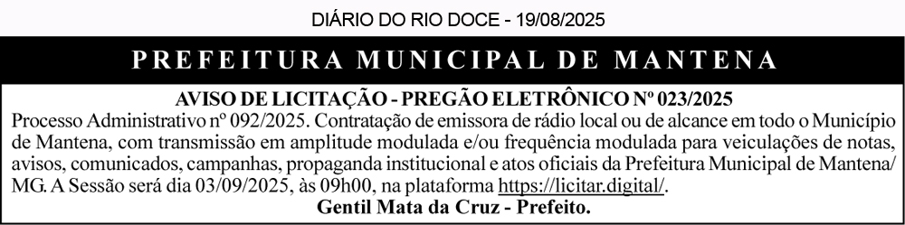A Câmara Municipal Mantena – MG, torna público que realizará licitação, na modalidade PREGÃO ELETRÔNICO nº. 04/2025, no Sistema de REGISTRO DE PREÇOS, para eventual fornecimento de produtos de panificação para atender as necessidades da Câmara Municipal de Mantena. A abertura ocorrerá no dia 28 de agosto de 2025, às 09h00min, pela PLATAFORMA DE LICITAÇÕES LICITAR DIGITAL (www.licitardigital.com.br). O Edital poderá ser adquirido pelo Portal Eletrônico http://www.licitardigital.com.br, bem como, no site www.camaramantena.mg.gov.br. ou pelos e-mails: licitacao@camaramantena.mg.gov.br e/ou cmmantena@gmail.com, Maiores informações poderão ser esclarecidas através do Telefone (0xx33) 3241-1555 – José Carlos Ferreira – Agente de Contratação.