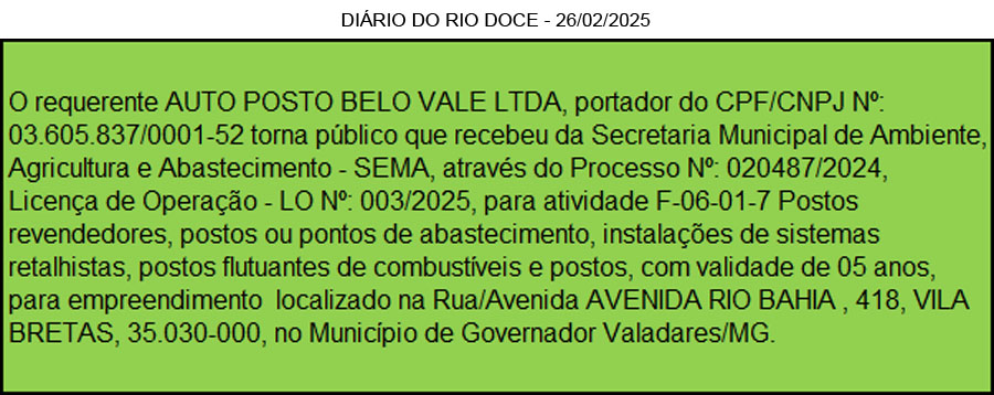 O requerente POSTO JK COMBUSTÍVEIS LTDA, portador do CPF/CNPJ Nº: 00.785.427/0001-42 torna público que recebeu da Secretaria Municipal de Ambiente, Agricultura e Abastecimento – SEMA, através do Processo Nº: 002865/2024, Renovação de Licença de Operação – LO Nº: 001/2025, para atividade F-06-01-7 Postos revendedores, postos ou pontos de abastecimento, instalações de sistemas retalhistas, postos flutuantes de combustíveis e postos, com validade de 05 anos, para empreendimento localizado na Rua/Avenida AVENIDA JK, 1639, VILA BRETAS , 35.030-210, no Município de Governador Valadares/MG.