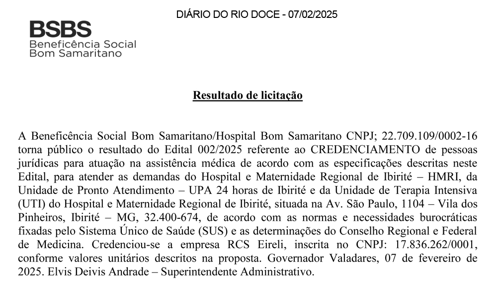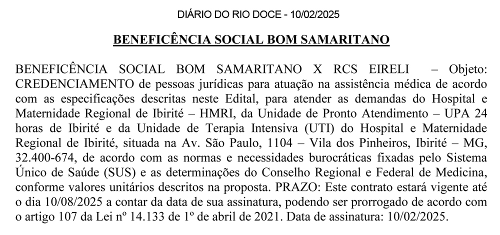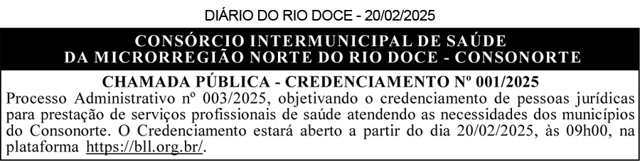 PREFEITURA MUNICIPAL DE GALILÉIA – MG. AVISO DE INEXIGIBILIDADE DE LICITAÇÃO NA FORMA DE CREDENCIAMENTO Nº 004/2025. O Município de Galiléia/MG comunica que será aberto o prazo para os interessados a partir de 06 de março de 2025 o Credenciamento para a Prestação de Serviços Médicos Especializados para a realização de Consultas e atendimentos nas Unidades de Saúde (CMS), em atendimento a solicitação da Secretaria de Saúde do Município de Galiléia/MG. Aquisição do Edital na sede da Prefeitura Municipal de Galiléia, MG, E-mail: licitacao@galileia.mg.gov.br, Site: http://galileia.mg.gov.br/licitacoes/ e Portal Nacional de Compras Públicas (PNCP). Tel: (33) 3244-1309. Galiléia, MG, 27/02/2025. Jonatas Melo Baltar – Secretário Municipal de Administração e Governo.