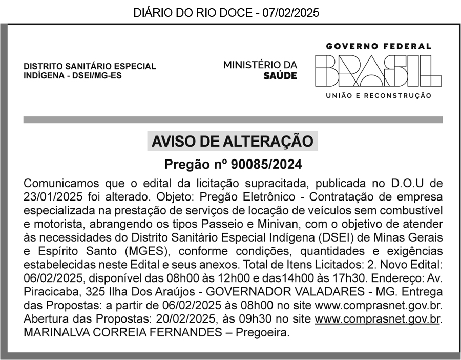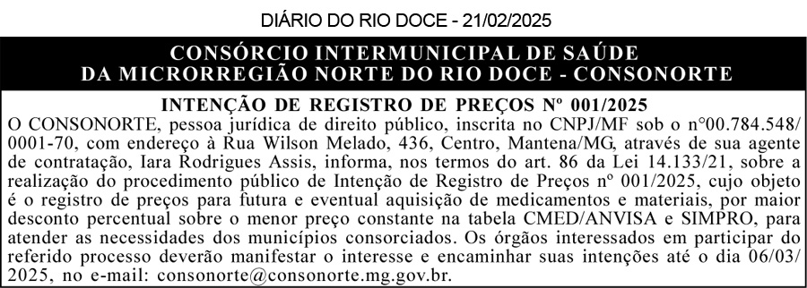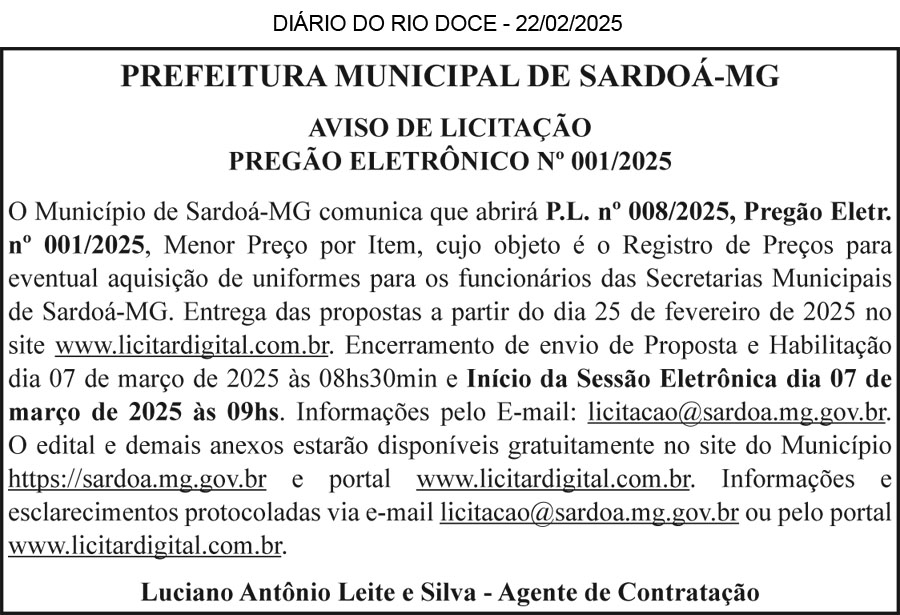 PREFEITURA MUNICIPAL DE CENTRAL DE MINAS/MG – AVISO DE RETIFICAÇÃO – PREGÃO ELETRÔNICO PARA REGISTRO DE PREÇOS Nº 02/2025 – Retifica-se o edital publicado no Diário Oficial de Minas Gerais, do dia 15/02/2025, Pág. 2, e no Diário do Rio Doce, edição do dia 15/02/2025, no caderno EDITAIS. ONDE SE LÊ: Início de recebimento das propostas: 09h:00min de 17/02/2025. Fim de recebimentos das propostas: 08h00min de 03/04/2025. Abertura de propostas: 28 de fevereiro de 2025 as 08h:30min. Disponibilização do edital e informações no endereço eletrônico: http://www.licitanet.com.br e https://www.centraldeminas.mg.gov.br/. Tel: (33) 99987 – 0067. LEIA-SE: INÍCIO DE RECEBIMENTO DAS PROPOSTAS: 09h:00min de 17/02/2025. FIM DE RECEBIMENTOS DAS PROPOSTAS: 08h00min de 28/02/2025. ABERTURA DE PROPOSTAS: 28 de fevereiro de 2025 as 08h:30min. Disponibilização do edital e informações no endereço eletrônico: http://www.licitanet.com.br e https://www.centraldeminas.mg.gov.br/. Tel: (33) 99987 – 0067.