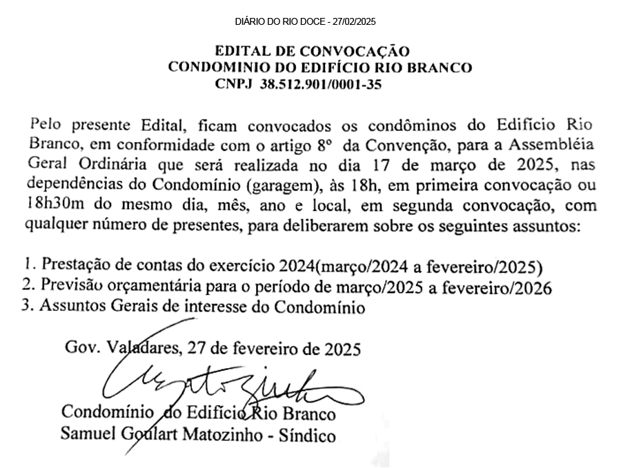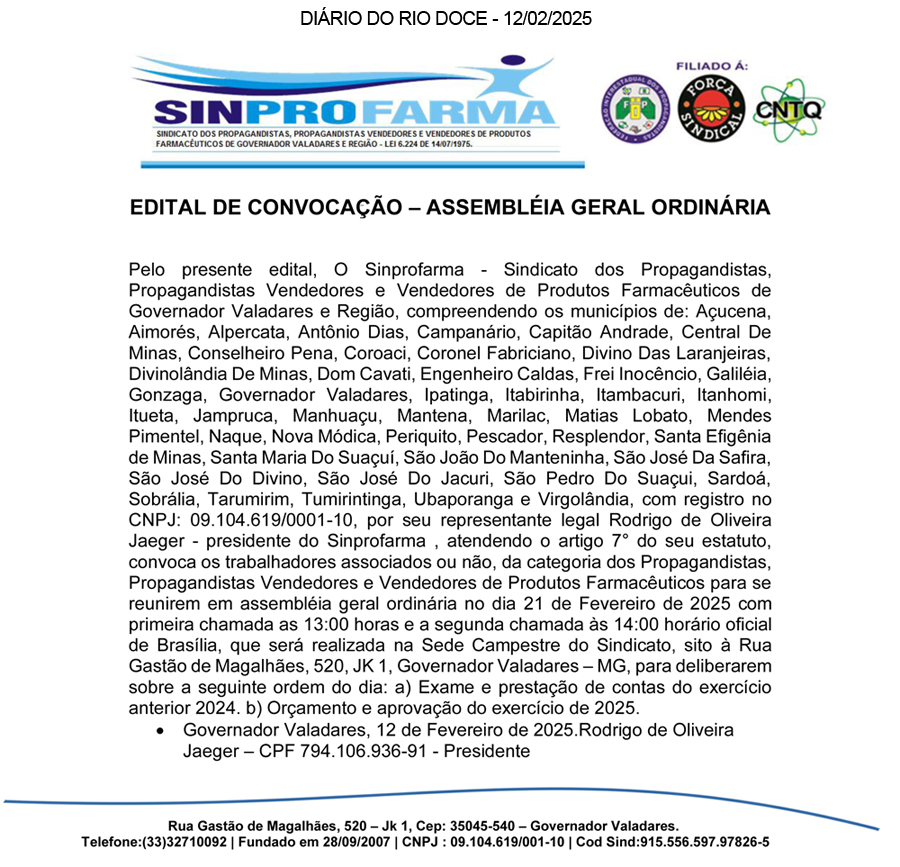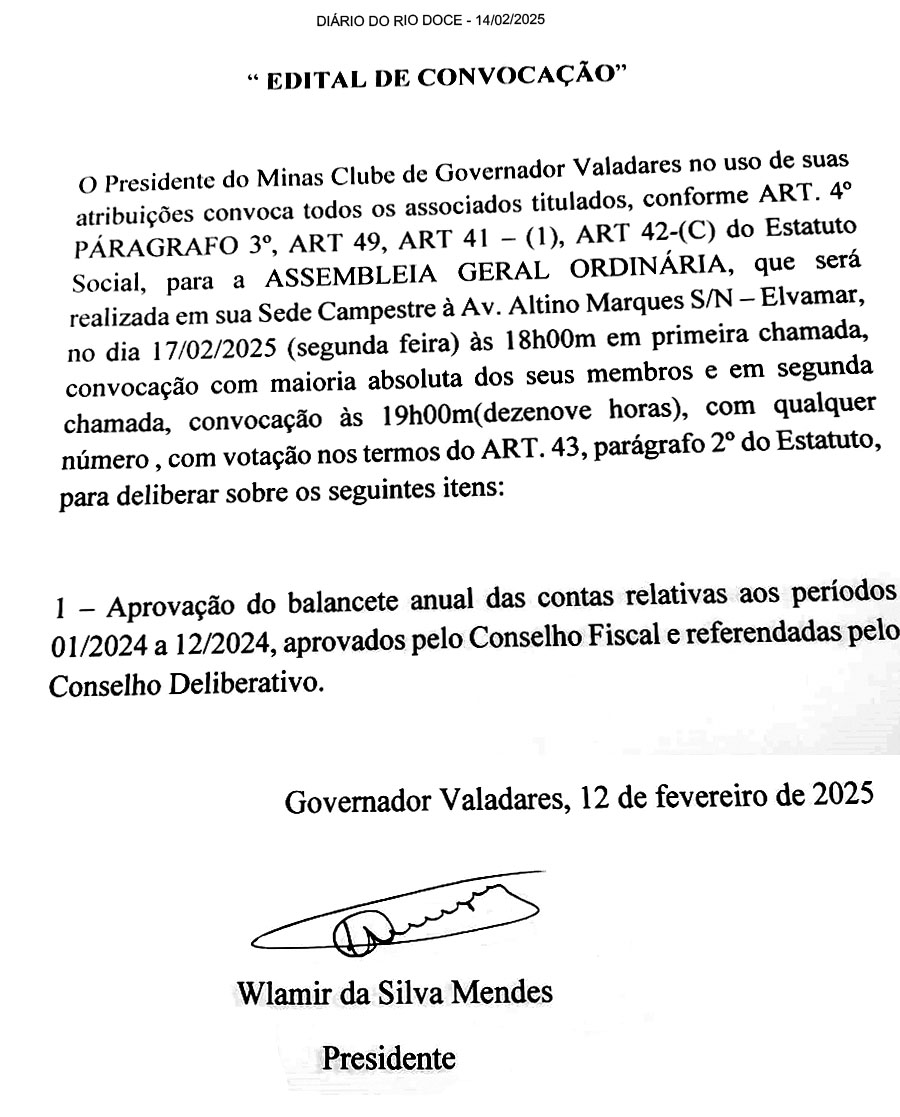 EDITAL DE CONVOCAÇÃO O Presidente do Conselho Deliberativo do Coopevale Futebol Clube, no uso das atribuições do Estatuto Social, em seu (Art. 53, Inciso I) por esse Edital, convoca os associados do clube especificados por categoria em seu Artigo 8 em pleno gozo de seus direitos estatutários para se reunirem em Assembléia Geral Ordinária, que se realizará no dia 28 de fevereiro de 2025, na sede social do clube à Rua Dona Zulmira Pereira Silva, 923 bairro São Paulo, Governador Valadares-MG, a realizar-se ás 09:00 horas com qualquer número de associados com direito a voto a fim de deliberarem sobre a seguinte ordem do dia:
