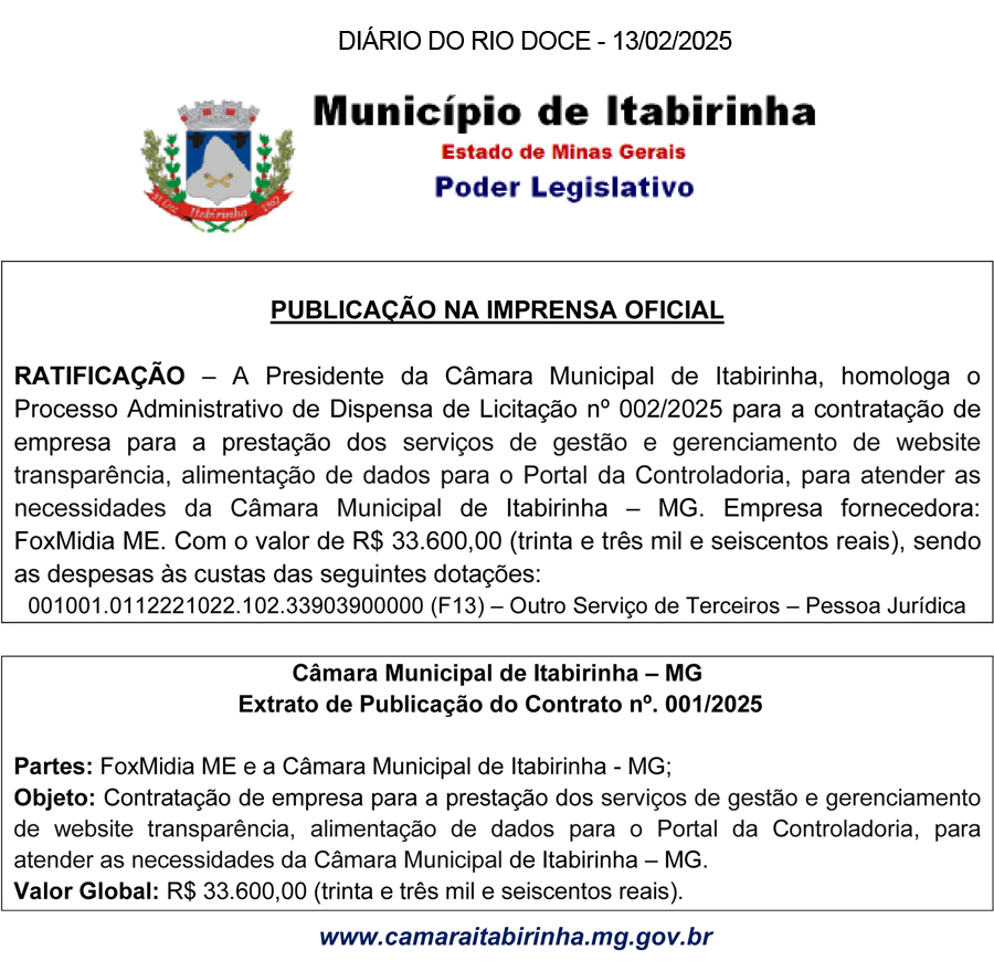 RATIFICAÇÃO – A Presidente da Câmara Municipal de Itabirinha, ratifica o Processo Administrativo de Inexigibilidade de Licitação nº 001/2025 para a contratação de empresa para a prestação dos serviços de Assessoria Jurídica para prestação de serviços técnico-jurídicos, atuando em processos legislativos, licitações, contratações, fornecimentos de pareceres e análises jurídicas para atender as necessidades da câmara Municipal de Itabirinha – MG. Empresa fornecedora: Lauro Bicalho Sociedade Individual de Advocacia. Com o valor de R$ 90.000,00 (noventa mil reais), sendo as despesas às custas das seguintes dotações: 001001.0103121012.101.33903500000 (F04) – Serviços de Consultoria