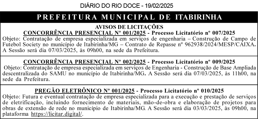 PREFEITURA MUNICIPAL DE SÃO JOÃO DO MANTENINHA – MG – PROCESSO LICITATÓRIO N°: 005/2025 – AVISO DE LICITAÇÃO – O Município de São João do Manteninha/MG, torna público, que abrirá o Processo Licitatório N°: 005/2025, na modalidade Pregão Eletrônico N°: 005/2024, tipo menor preço por item, cujo objeto é a contratação de empresa especializada em engenharia civil para prestação de serviços técnicos de consultoria e assessoria, abrangendo: a responsabilidade técnica em obras e serviços de engenharia; elaboração de projetos arquitetônicos e complementares; e fiscalização de obras públicas, de acordo com as demandas do Município de São João do Manteninha/MG. A abertura será dia 26/02/2025 às 09h20, na Plataforma www.licitardigital.com.br. Os interessados poderão retirar o edital e obter informações pelo Email: pmsjmlicita@gmail.com, pelo site https://www.saojoaodomanteninha.mg.gov.br/ ou na sala de reuniões da Prefeitura, na Avenida Reginaldo Alves dos Santos, 59 – Centro – São João do Manteninha /MG nos dias úteis no horário 07:00 às 13:00. Walter Filho Ramos – Agente de Contratação.