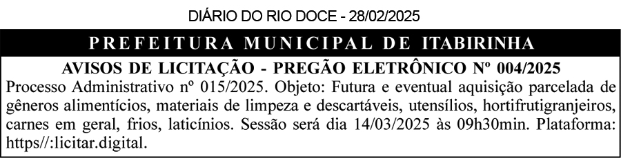 PREFEITURA MUNICIPAL DE DIVINO DAS LARANJEIRAS – MG, AVISO DE LICITAÇÃO, Processo Licitatório Nº 04/2025, Pregão Nº 04/2025, na forma eletrônica. Objeto: Registro de preços de gêneros alimentícios para merenda escolar, a fim de suprir as necessidades das Escolas da Rede Municipal de Ensino de Divino das Laranjeiras. Data da abertura: 17/03/2025 às 09h00. através do sistema COMPRASGOV. Aquisição do edital na sede da Prefeitura Municipal de Divino das Laranjeiras, MG, e-mail: licitacao@divinodaslaranjeiras.mg.gov.br, site: http://divinodaslaranjeiras.mg.gov.br/licitacoes/, tel (33) 99912-1893.