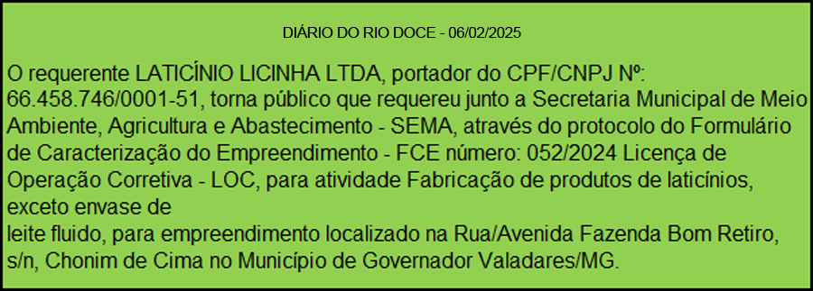 “O requerente MFS COMBUSTIVEIS E SERVIÇOS LTDA, portador do CPF/CNPJ Nº: 46.513.648/0001-62 torna público que recebeu da Secretaria Municipal de Ambiente, Agricultura e Abastecimento – SEMA, através do Processo Nº: 016084/2024, Licença de Instalação Corretiva – LIC Nº: 028/2024, para atividade F-06-01-7 Postos revendedores, postos ou pontos de abastecimento, instalações de sistemas retalhistas, postos flutuantes de combustíveis e postos, com validade de 05 anos, para empreendimento localizado na Rua/Avenida RUA JOSE OTAVIO FONSECA, 321, VILA ISA, 35.044-170, no Município de Governador Valadares/MG.”