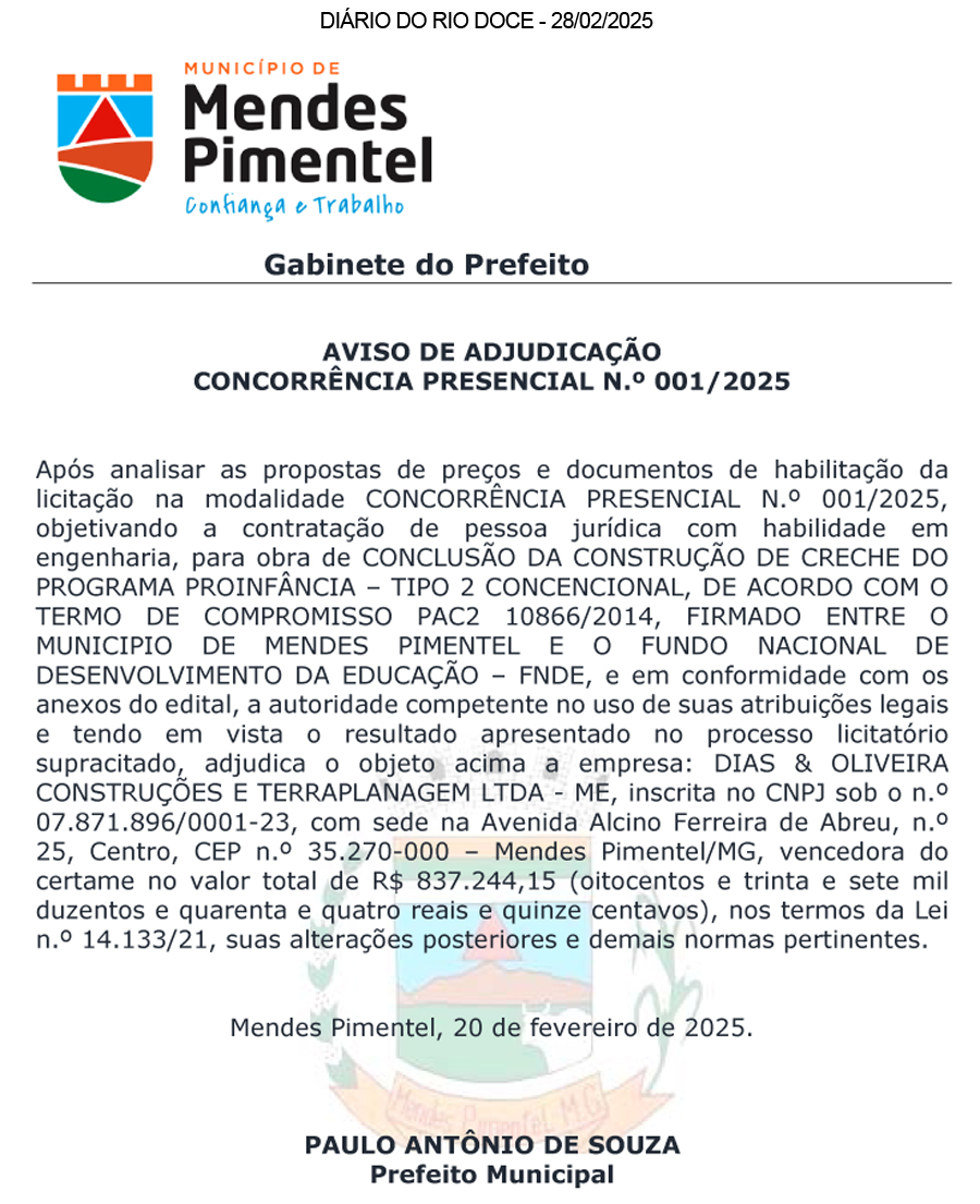 O Município de Mendes Pimentel (MG), torna público, para conhecimento dos interessados que fará realizar no dia 17 de fevereiro de 2025, as 09h00min (nove horas), licitação da modalidade Concorrência, na sua forma presencial, com critério de julgamento por menor preço global, sob a égide da Lei n.º 14.133/21 e suas alterações posteriores, tendo por objeto a Contratação de pessoa jurídica com habilidade em engenharia, para obra de “CONCLUSÃO DA CONSTRUÇÃO DE CRECHE DO PROGRAMA PROINFÂNCIA – TIPO 2 CONCENCIONAL, DE ACORDO COM O TERMO DE COMPROMISSO PAC2 10866/2014, FIRMADO ENTRE O MUNICIPIO DE MENDES PIMENTEL E O FUNDO NACIONAL DE DESENVOLVIMENTO DA EDUCAÇÃO – FNDE”, através do canal do município no YouTube: https://www.youtube.com/@licitamendes, sendo conduzida pelo Agente de Contratação. O edital e seus anexos encontram-se disponíveis na página da web no Portal da Transparência no sitio do Município www.mendespimentel.mg.gov.br, link “Licitações”. Esclarecimentos adicionais na sala da Comissão de Licitações no Paço Municipal, Praça Benedito Quintino, n.º 15, CEP: 35.270-000, Centro – Mendes Pimentel/MG, de 2ª a 6ª feira, no horário das 08h00min às 16h00min ou pelo e-mail licitacao@mendespimentel.mg.gov.br.