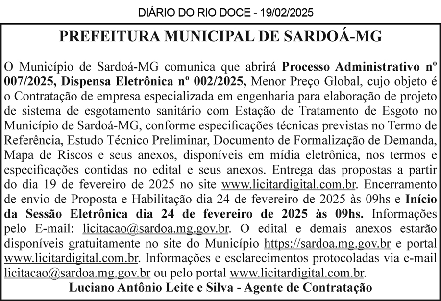 AVISO DE LICITAÇÃO – CONCORRÊNCIA PRESENCIAL TIPO MENOR PREÇO N° 01/2025 – O Município de tambem torna público para conhecimento dos interessados, que realizará no dia 21 de fevereiro de 2025, às 13:00, na Sede da Prefeitura Municipal estabelecida na Rua Belo Horizonte, nº 45, Centro de São Jose da Safira-MG, PROCESSO LICITATÓRIO N° 08/2025, na modalidade CONCORRÊNCIA PRESENCIAL TIPO MENOR PREÇO N° 01/2025, para contratação de empresa especializada em execução de rede de esgotamento sanitário através do Convenio TC/PAC 0360/14 realizado entre a FUNASA e o Município de São Jose da Safira-MG. Cuja as cópias poderão ser adquiridas junto ao setor de licitações, no referido endereço supracitado, no horário de 12:00 às 18:00 horas, nos dias úteis, assim como no email: licitacaosafira@hotmail.com. São Jose da Safira – MG, 05 de fevereiro de 2025. Sandra Pereira da Silva – Agente de Contratação.