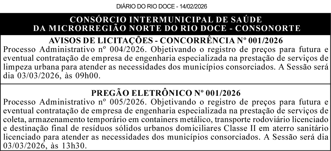 AVISO DE LICITAÇÃO – PREGÃO ELETRÔNICO PARA SRP Nº 005/2026 – Comunica que abrirá Pregão Eletrônico para SRP nº 005/2026, para Aquisição de Veículos. O julgamento será através da plataforma “LicitarDigital” pelo link: www.licitardigital.com.br no dia 05/03/2026, as 10h00m. Informações no tel: (33) 9.8827-5063, com Sthéfany de Souza Rocha – Pregoeira Oficial.
