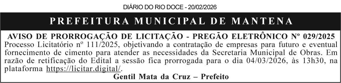 No Aviso de Licitação, publicado no Diário do Rio Doce – Editais, de 29 de janeiro de 2026, onde lê-se que a abertura da sessão, objetivando a Contratação de pessoa jurídica com habilidade em engenharia, para obra de EXECUÇÃO DE AÇÕES DE RECONSTRUÇÃO NO MUNICÍPIO DE MENDES PIMENTEL, CONTEMPLANDO: META 1 – RECONSTRUÇÃO DE DRENAGEM NO CÓRREGO FRIO, COM A CONSTRUÇÃO DE BSCC 3,00 X 3,00 M, com recursos provenientes da Secretaria Nacional de Proteção e Defesa Civil – Protocolo n.º REC-MG-3141504-20251204-06, Processo n.º 59053.023934/2025-11, fará realizar no dia 13 de fevereiro de 2026, às 09h00min, LEIA-SE: 23 DE FEVEREIRO DE 2026, às 09h00min.