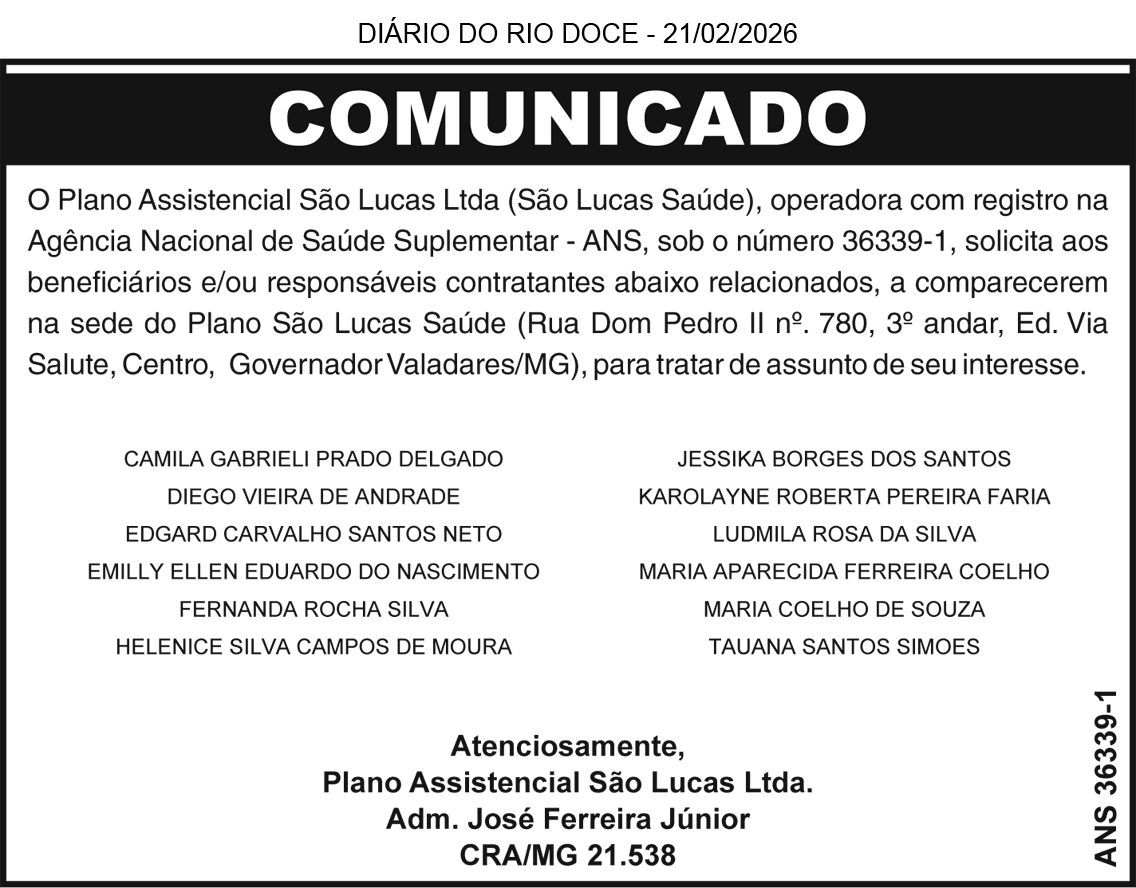 DIÁRIO DO RIO DOCE – 21/02/2026