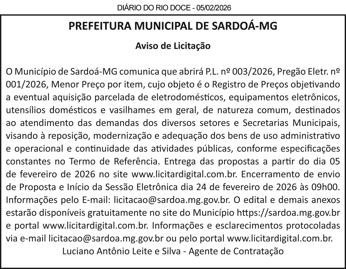 PREFEITURA MUNICIPAL DE PERIQUITO, Pregão Eletrônico nº 002/2026, Aviso de Licitação. O Município de Periquito torna público que fará realizar, às 8h30min, do dia 19 de fevereiro de 2026, licitação pública na modalidade pregão eletrônico visando o registro de preços para futura e eventual aquisição de utensílios de cozinha para atender às necessidades das secretarias da prefeitura municipal de Periquito/MG. A abertura do certame ocorrerá na Plataforma Licitar Digital – www.licitardigital.com.br. Os interessados poderão retirar o Edital pelo site www.licitardigital.com.br ou www.periquito.mg.gov.br e ainda na sala do Departamento de Licitações na Avenida Senador Getúlio de Carvalho, 271, Centro, Periquito/MG. Informações complementares poderão ser obtidas através dos telefones (33) 3298-3010 / 3298-3013.