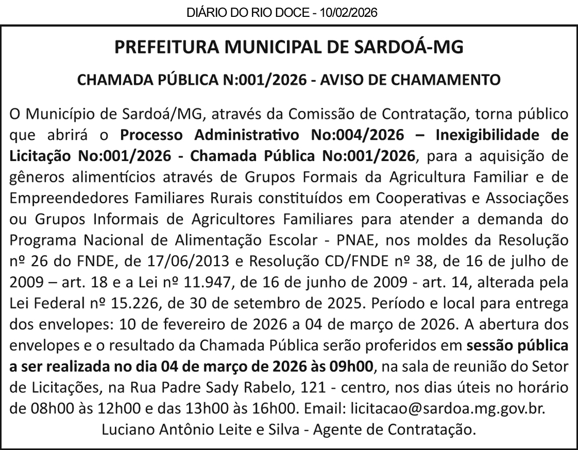 PREFEITURA MUNICIPAL DE COROACI/MG – AVISO DE CHAMADA PÚBLICA Nº 001/2026 – O Município de Coroaci/MG, torna público que abrirá Inexigibilidade No: 001/2026 – Chamada Pública No: 001/2026, para a aquisição de gêneros alimentícios através de Grupos Formais da Agricultura Familiar e de Empreendedores Familiares Rurais constituídos em Cooperativas e Associações ou Grupos Informais de Agricultores Familiares para atender a demanda do Programa Nacional de Alimentação Escolar – PNAE, nos moldes da Lei Nº:11.947/2009. Inicio: 31/03/2026 às 10h00m. Endereço e Local: www.licitardigital.com.br. Informações: através do tel (0xx33) 98451-8685, ou e-mail: licitacaocoroaci2017@gmail.com – Mateus Felipe de Souza Carvalho Cardoso – Agente de Contratação.