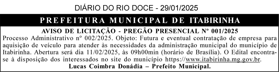PREFEITURA MUNICIPAL DE SÃO JOÃO DO MANTENINHA – MG – RETIFICAÇÃO DO PROCESSO LICITATÓRIO N°: 001/2025 – AVISO DE LICITAÇÃO – O Município de São João do Manteninha/MG, através do Agente de Contratação, comunica que no aviso de edital mencionada acima, publicado no Diário do Rio Doce no dia 21/01/2025, Seção Editais, onde se lê “Pregão Eletrônico 001/2024”, leia-se “Pregão Eletrônico 001/2025”.