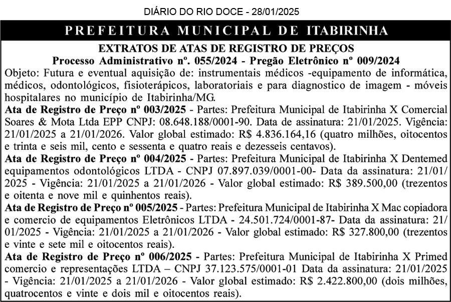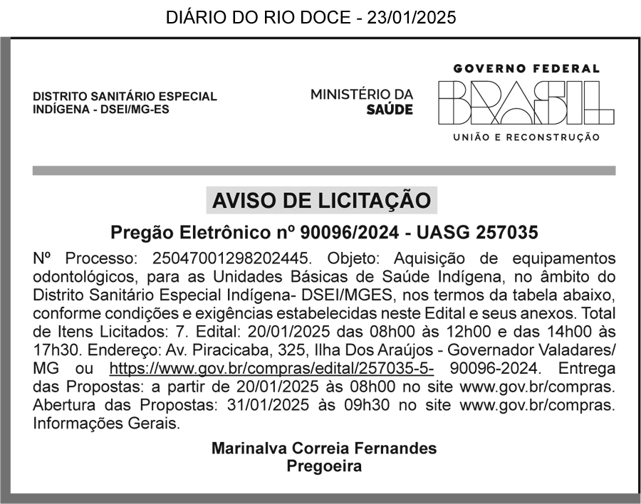 Pregão Eletrônico nº 002/2025 – Processo Licitatório nº 004/2025. Objeto: Registro de preços para futura e eventual aquisição de próteses odontológicas removíveis, com fornecimento personalizado e prestação de serviços, por especialista em prótese dentária, de moldagem e ajuste nos pacientes, em atendimento ao Programa Brasil Sorridente. Julgamento: 13/02/2025 às 14h00min. Larissa Campos Soares, Pregoeira.