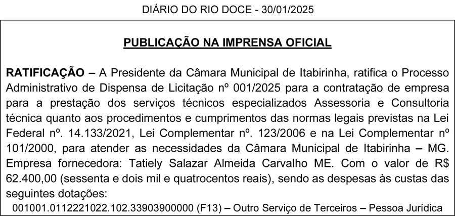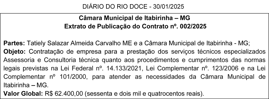 Partes: Câmara Municipal de Itabirinha X Exatus Assessoria e Consultoria Pública Ltda