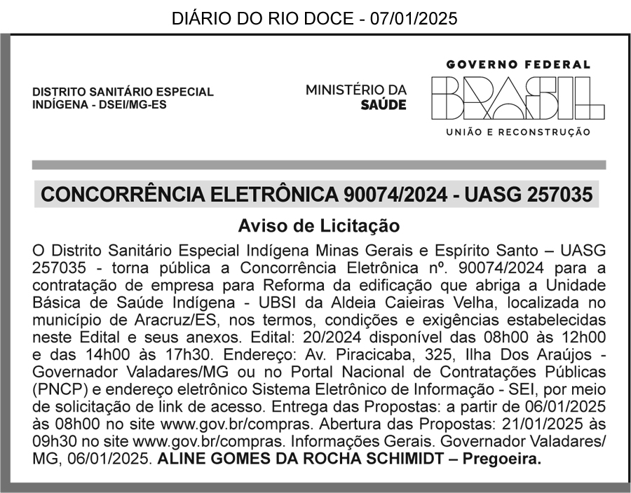PREFEITURA MUNICIPAL DE DIVINO DAS LARANJEIRAS – MG, AVISO DE RETIFICAÇÃO, PROCESSO LICITATÓRIO Nº 11/2024, Concorrência Nº 04/2024 – Comunicamos que o AVISO DE LICITAÇÃO do Processo Licitatório Nº 11/2024 – Concorrência Nº 04/2024, publicado no Diário do Rio Doce, de 24 de dezembro de 2024, que possui como objeto a prestação de serviços de engenharia para construção de centro de eventos no Município de Divino das Laranjeiras, conforme Contrato de Repasse nº 960091/2024/MTUR/CAIXA, com abertura prevista para 16/01/2025, teve sua data de abertura alterada, em decorrência do Decreto nº 309, de 31 de dezembro de 2024, que dispôs sobre ponto facultativo nos dias 02 e 03 de janeiro de 2025 na Prefeitura Municipal e todas as suas Secretarias, necessitando alterar a data de abertura para o dia 27/01/2025, às 09h00, não havendo nenhuma alteração no instrumento editalício e seus anexos, sem prejuízo ao certame. O edital com a data retificada encontra-se disponibilizado em sítio eletrônico do sistema de compras do Governo Federal, no sítio eletrônico do Município http://divinodaslaranjeiras.mg.gov.br/licitacoes/.