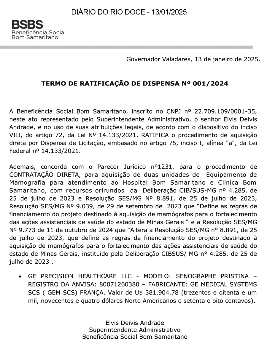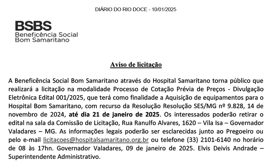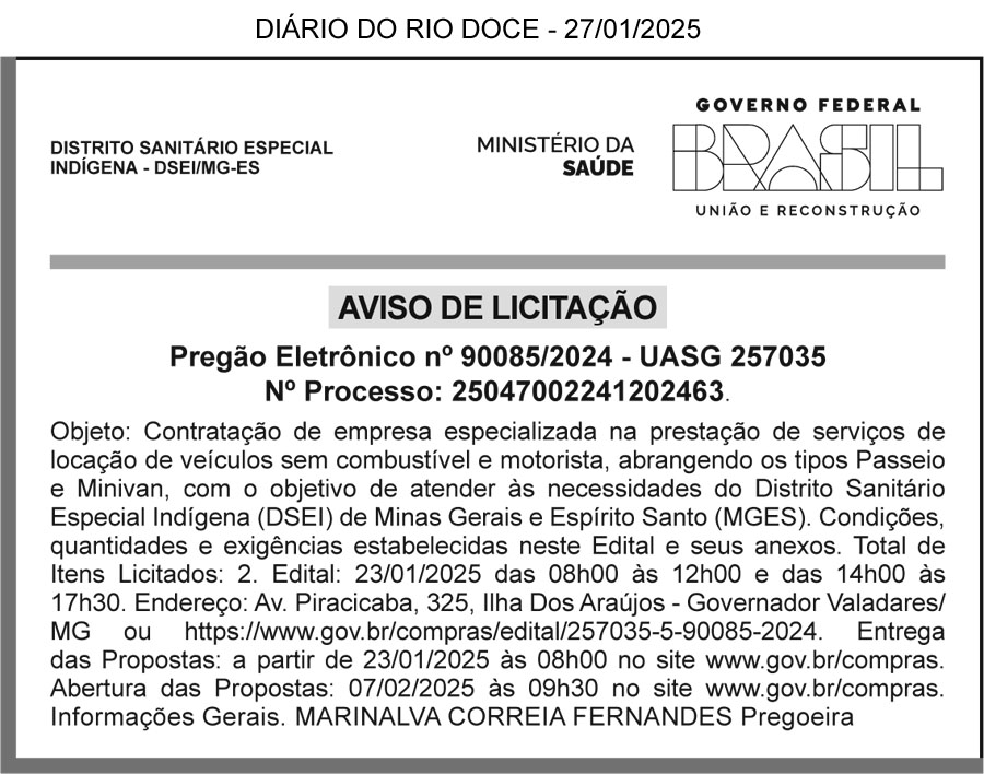 PREFEITURA MUNICIPAL DE SÃO JOÃO DO MANTENINHA – MG – PROCESSO ADMINISTRATIVO N°: 005/2025 – AVISO DE CONTRATAÇÃO – O Município de São João do Manteninha/MG, torna público, que abrirá o Processo Administrativo N°: 005/2025, na modalidade Dispensa Eletrônica N°: 001/2025, tipo menor preço por item, cujo objeto é Registro de preços para futuro e eventual fornecimento de gases medicinais (oxigênio medicinal), bem como a locação de cilindros, para atender às demandas da rede municipal de saúde do Município de São João do Manteninha/MG. A fase de lances será dia 30/01/2025 das 08h00 às 14h00, na Plataforma www.licitardigital.com.br. Os interessados poderão retirar o edital e obter informações pelo Email: pmsjmlicita@gmail.com, pelo site https://www.saojoaodomanteninha.mg.gov.br/ ou na sala de reuniões da Prefeitura, na Avenida Reginaldo Alves dos Santos, 59 – Centro – São João do Manteninha /MG nos dias úteis no horário 07:00 às 13:00. Walter Filho Ramos – Agente de Contratação.