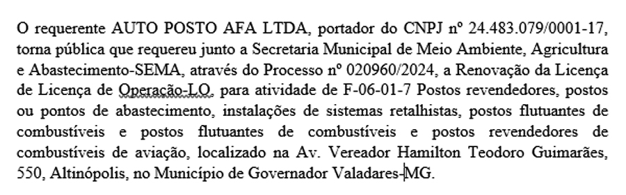 O requerente AUTO POSTO COPAC LTDA, portador do CPF/CNPJ Nº: 18.461.038/0001-27, torna público que requereu junto a Secretaria Municipal de Meio Ambiente, Agricultura e Abastecimento – SEMA, através do Processo Número: 000580/2025, Renovação de Licença de Operação – LO, para atividade F-06-01-7 Postos revendedores, postos ou pontos de abastecimento, instalações de sistemas retalhistas, postos flutuantes de combustíveis e postos revendedores de combustíveis de aviação, para empreendimento localizado na Rua/Avenida Israel Pinheiro, 3612, Centro no Município de Governador Valadares/MG.
