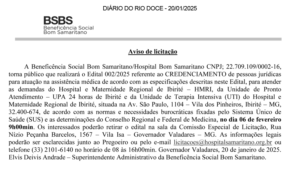PREFEITURA MUNICIPAL DE GALILÉIA – MG. AVISO DE INEXIGIBILIDADE DE LICITAÇÃO NA FORMA DE CREDENCIAMENTO Nº 001/2025. O Município de Galiléia/MG comunica que será aberto o prazo para os interessados a partir de 30 de janeiro de 2025 o Credenciamento para a Prestação de Serviços Médicos para a realização de Consultas e Atendimentos nas Unidades de Saúde (ESF’s) e no Pronto Atendimento Municipal em Regime de Plantão seja ele Diurno e/ou Noturno, em atendimento a solicitação da Secretaria de Saúde do Município de Galiléia/MG. Aquisição do Edital na sede da Prefeitura Municipal de Galiléia, MG, E-mail: licitacao@galileia.mg.gov.br, Site: http://galileia.mg.gov.br/licitacoes/ e Portal Nacional de Compras Públicas (PNCP). Tel: (33) 3244-1309. Galiléia, MG, 28/01/2025. Jonatas Melo Baltar – Secretário Municipal de Administração e Governo.