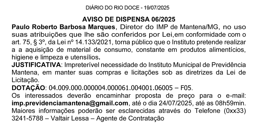 A Câmara Municipal Mantena – MG, torna público que realizará licitação, na modalidade DISPENSA nº. 03/2025, para locação de sistema integrado para processo legislativo eletrônico e digital em plataforma web, controle das funções da casa legislativa, protocolo online, votação plenária presencial ou híbrida, processo legislativo digital, sistema de ouvidoria, portal legislativo e compilação das normas com assinatura digital, integração do legislativo ao executivo municipal, incluindo implantação do sistema, migração e conversão de dados, suporte técnico especializado e treinamento de pessoal conforme especificações técnicas constantes ao Termo de Referência. JUSTIFICATIVA: Modernizar o processo legislativo, permitindo o controle de todo o processo legislativo, melhorando assim o tempo das sessões, aumentando a transparência e a confiabilidade do processo legislativo, e garantindo maior eficiência no trabalho da Câmara Municipal de Mantena/MG, alinhando-se às melhores práticas de governança pública. DOTAÇÃO ORÇAMENTARIA: 00002.0103110014.001.33903900000 (Fc.10) VALOR ESTIMADO: R$ 61.433,37 (sessenta e um mil quatrocentos e trinta e três reais e trinta e sete centavos), englobando implantação, locação mensal e treinamento. Os interessados deverão encaminhar proposta de preço para o e-mail: cmmantena@gmail.com, até o dia 30/07/2025, até às 08h59min. Maiores informações poderão ser esclarecidas através do Telefone (0xx33) 3241-1555 – José Carlos Ferreira – Agente de Contratação.