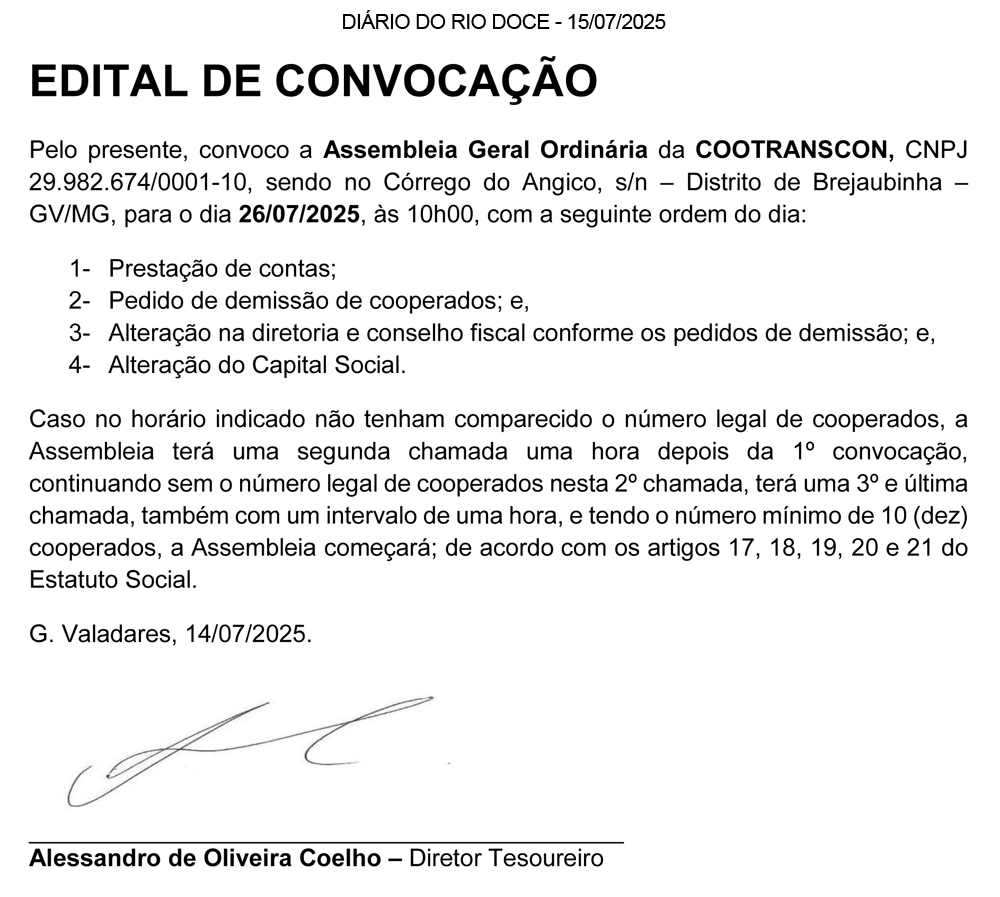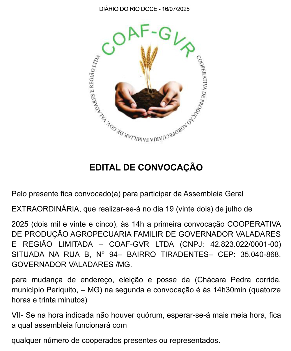 Pelo presente fica convocado(a) para participar da Assembleia Geral EXTRAORDINÁRIA, que realizar-se-á no dia 19 (dezenove) de julho de 2025 (dois mil e vinte e cinco), às 14h a primeira convocação para eleição e posse da diretoria de endereço COOPERATIVA DE PRODUÇÂO AGROPECUARIA FAMILIAR DE GOVERNADOR VALADARES E REGIÂO LIMITADA – COAF-GVR LTDA (CNPJ: 42.823.022/0001-00) SITUADA NA RUA B, Nº 94– BAIRRO TIRADENTES– CEP: 35.040-868, GOVERNADOR VALADARES /MG (FAZENDA Córrego de Areia) no distrito de Pontal, no município de Governador Valadares – MG) na segunda e convocação é às 14h30min (quatorze horas e trinta minutos)