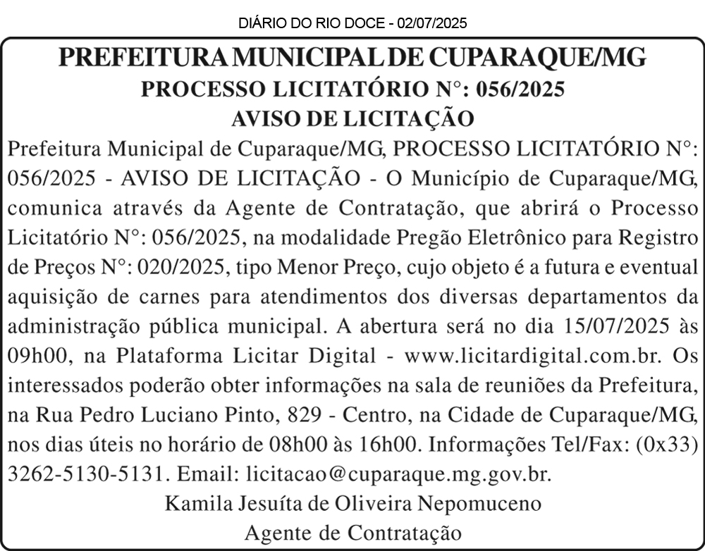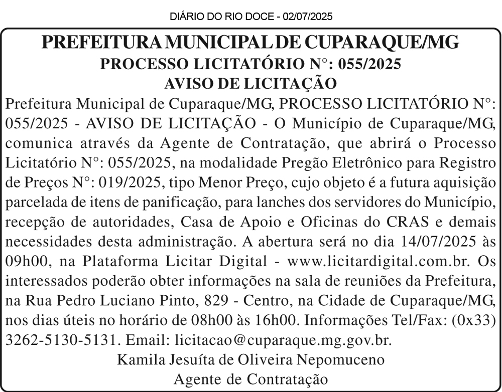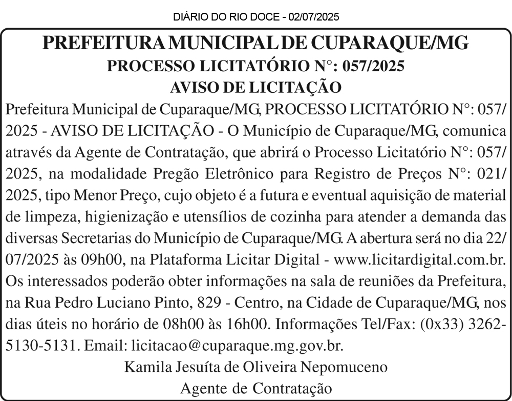 PREFEITURA MUNICIPAL DE CUPARAQUE – MG, PROCESSO LICITATÓRIO N°: 061/2025, AVISO DE LICITAÇÃO – O Município de Cuparaque/MG, comunica através da Agente de Contratação, que abrirá o Processo Licitatório N°: 061/2025, na modalidade Pregão Eletrônico para Registro de Preços N°: 023/2025, tipo Menor Preço, cujo objeto é a futura e eventual contratação de empresa para a prestação de serviços de serralheria, incluindo o material o fornecimento de materiais, para atender as necessidades das Secretarias Municipais. A abertura será no dia 05/08/2025 às 09h00, na Plataforma Licitar Digital – www.licitardigital.com.br. Os interessados poderão obter informações na sala de reuniões da Prefeitura, na Rua Pedro Luciano Pinto, 829 – Centro, na Cidade de Cuparaque/MG, nos dias úteis no horário de 08h00 às 16h00. Informações Tel/Fax: (0x33) 3262-5130-5131. E-mail: licitacao@cuparaque.mg.gov.br.