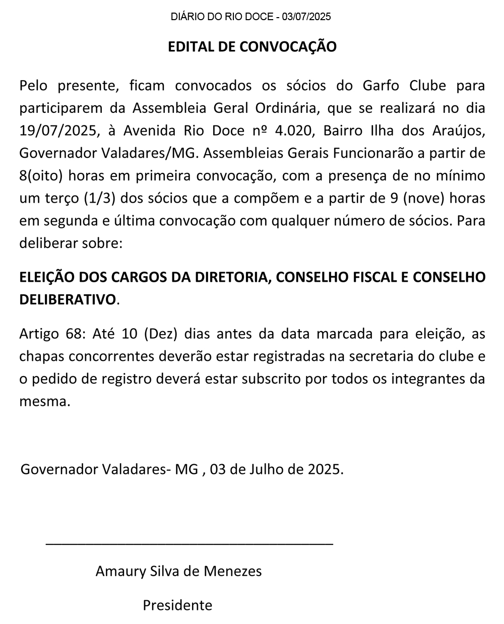 O Grupo de Apoio e Prevenção Oncológico de Governador Valadares – GAPON, inscrito no CNPJ/MF nº 03.440.193/0001-90, através do presente EDITAL, e na forma do art. 60 do Código Civil, através de 1/5 (um quinto) de seus membros, CONVOCA, os seus membros para a Assembleia Geral Ordinária destinada a ELEIÇÃO E POSSE DA NOVA DIRETORIA E CONSELHO FISCAL, que será realizada às 19:30h do dia 18 de julho de 2025, sexta-feira (art. 11º do Estatuto do GAPON), na sede deste Grupo GAPON na rua Afonso Pena, nº 2701, sala 103, centro, nesta cidade de Governador Valadares, MG. A Assembleia Geral Eletiva se estende a todos os sócios quites com suas obrigações. Em caso de presença inferior a 2/3 (dois terços) dos membros (§ único do art. 14º do Estatuto do GAPON) ocorrerá a segunda convocação às 20h do mesmo dia, com qualquer número de sócios presentes. As chapas concorrentes deverão ser inscritas, via requerimento escrito, destinado ao GAPON até as 72h (setenta e duas horas) antes da Assembleia Geral, ou seja, até o dia 15 de julho de 2025 no endereço supramencionado. Oneide Alves Lima, Sonia Maria Moura Neto e Maria Eliza Miranda Costa Brando (1/5 dos membros)