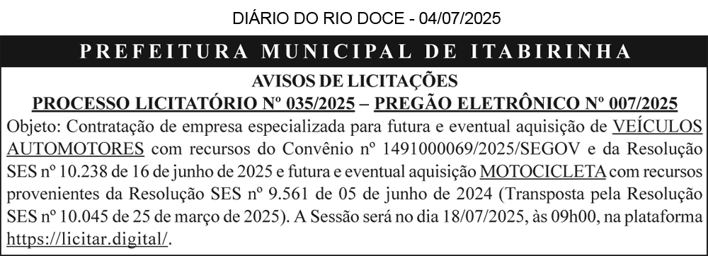 PREFEITURA MUNICIPAL DE SÃO JOÃO DO MANTENINHA – MG – PROCESSO LICITATÓRIO N°:018/2025 – AVISO DE LICITAÇÃO – O Município de São João do Manteninha/MG, torna público, que abrirá o Processo Licitatório N°: 018/2025, na modalidade Pregão Eletrônico N°: 012/2025, tipo menor preço por item, cujo objeto é a Aquisição de Diesel Comum com fornecimento contínuo e fracionado para atender as demandas da frota do Município de São João do Manteninha/MG. A abertura será dia 31/07/2025 às 09h20, na plataforma www.licitardigital.com.br. Os interessados poderão retirar o edital e obter informações pelo Email: pmsjmlicita@gmail.com, pelo site https://www.saojoaodomanteninha.mg.gov.br/, na plataforma www.licitardigital.com.br ou na sala de reuniões da Prefeitura, na Avenida Reginaldo Alves dos Santos, 59 – Centro – São João do Manteninha /MG nos dias úteis no horário 07:00 às 13:00. Walter Filho Ramos –Agente de Contratação.