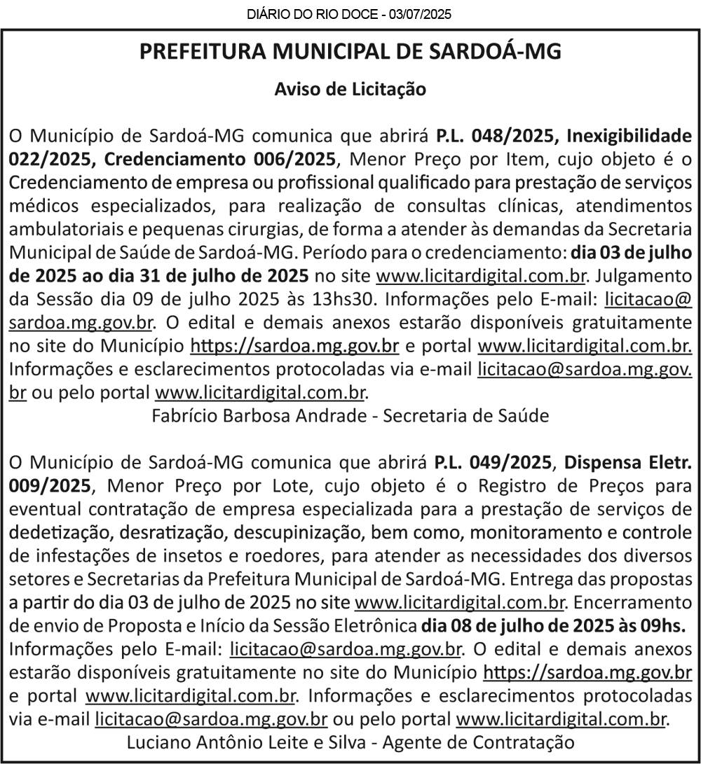 PREFEITURA MUNICIPAL DE SÃO GERALDO DA PIEDADE – MG – PROCESSO LICITATÓRIO Nº:054/2025 – AVISO DE LICITAÇÃO – O Município de São Geraldo da Piedade/MG, torna pública aos interessados que será realizada licitação, modalidade Inexigibilidade Nº:016/2025, na forma de Credenciamento Nº:002/2025 “Menor Preço”, na plataforma www.licitardigital.com.br, cujo objeto é o Chamamento Público na forma de Credenciamento para a contratação de profissionais médicos especializados em Ginecologia para a prestação de serviços de consultas especializadas no âmbito do Sistema Único de Saúde (SUS), conforme as necessidades da Secretaria Municipal de Saúde de São Geraldo da Piedade. A partir do dia 24 de julho de 2025, no setor de Licitações. O edital encontra se a disposição dos interessados a partir desta data, no horário de 07h30min às 11h30min e das 13h00 às 17h00, no endereço acima, informações através do telefone (33) 3238-1117 / 98817-0187, e através de Email: cpl@saogeraldodapiedade.mg.gov.br.