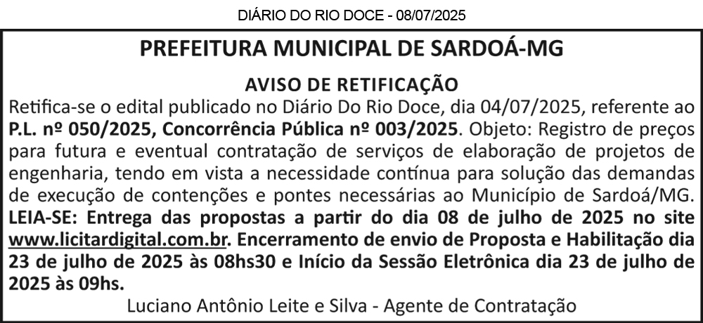 O Município de São Geraldo da Piedade/MG, comunica através da Agente de Contratação, comunica que no aviso de edital mencionado acima, publicado no Diário do Rio Doce, no dia 08 de julho de 2025, Editais, onde se lê: “Concorrência Eletrônica N°:002/2025”, leia-se: Pregão Eletrônico N°:016/2025. A abertura será dia 24/07/2025 às 09h00, na Plataforma Licitar Digital.