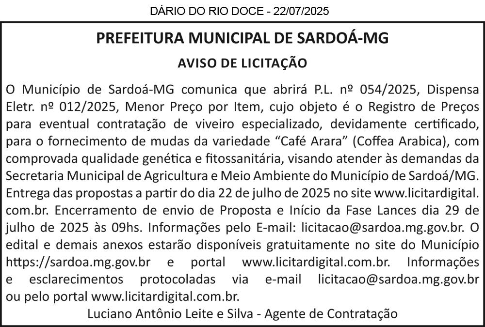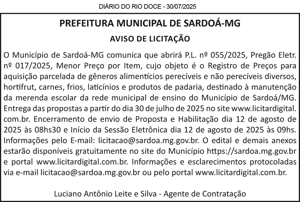 PREFEITURA MUNICIPAL DE COROACI/MG – AVISO DE LICITAÇÃO – PREGÃO ELETRÔNICO SRP Nº 019/2025 – O Município de Coroaci/MG comunica que realizará o Pregão Eletrônico SRP nº 019/2025, cujo objeto é a contratação de serviços de restaurante. O julgamento das propostas de preços e habilitação ocorrerá no dia 25/07/2025 às 09h00, na sala do setor de licitação da Prefeitura Municipal de Coroaci/MG, situada na Rua Dona Cotinha Gonçalves, nº 11 – Centro – CEP: 39.710-000. Mais informações pelo telefone (33) 9.8451-8656 ou e-mail: licitacao@coroaci.mg.gov.br, com o Agente de Contratação Mateus Felipe de Souza Carvalho Cardoso.