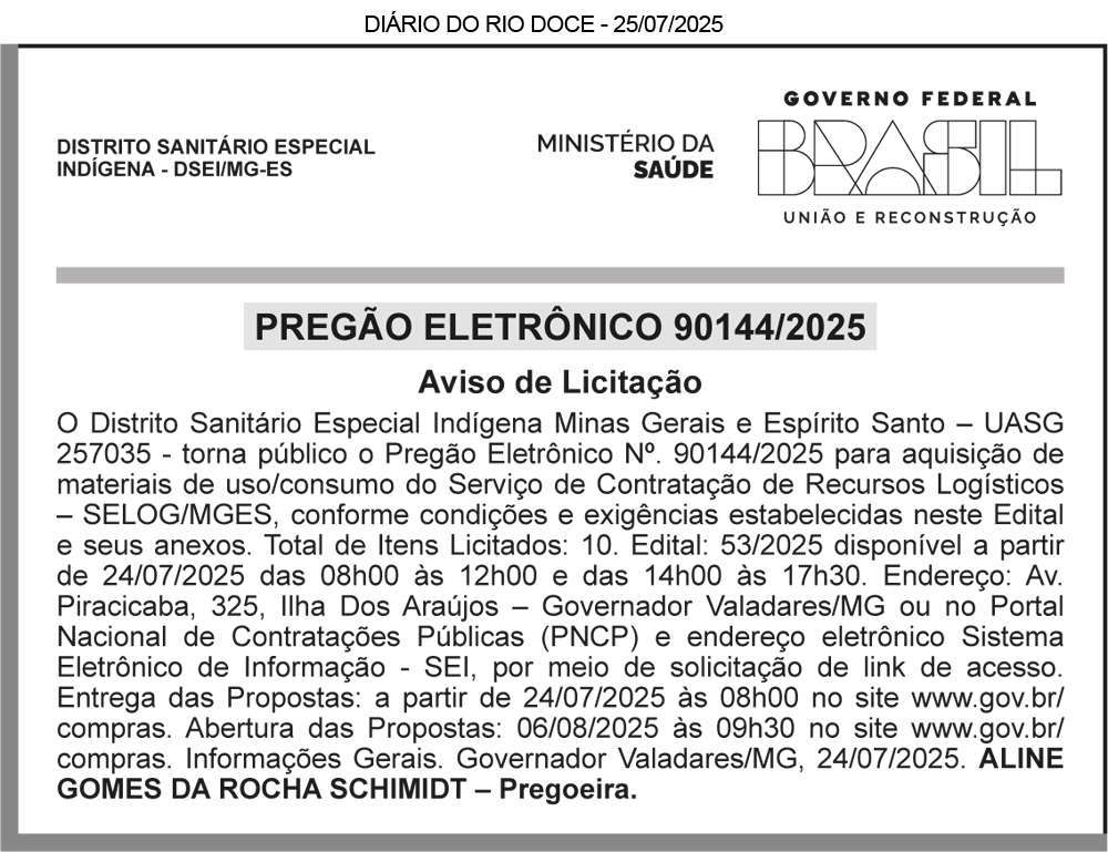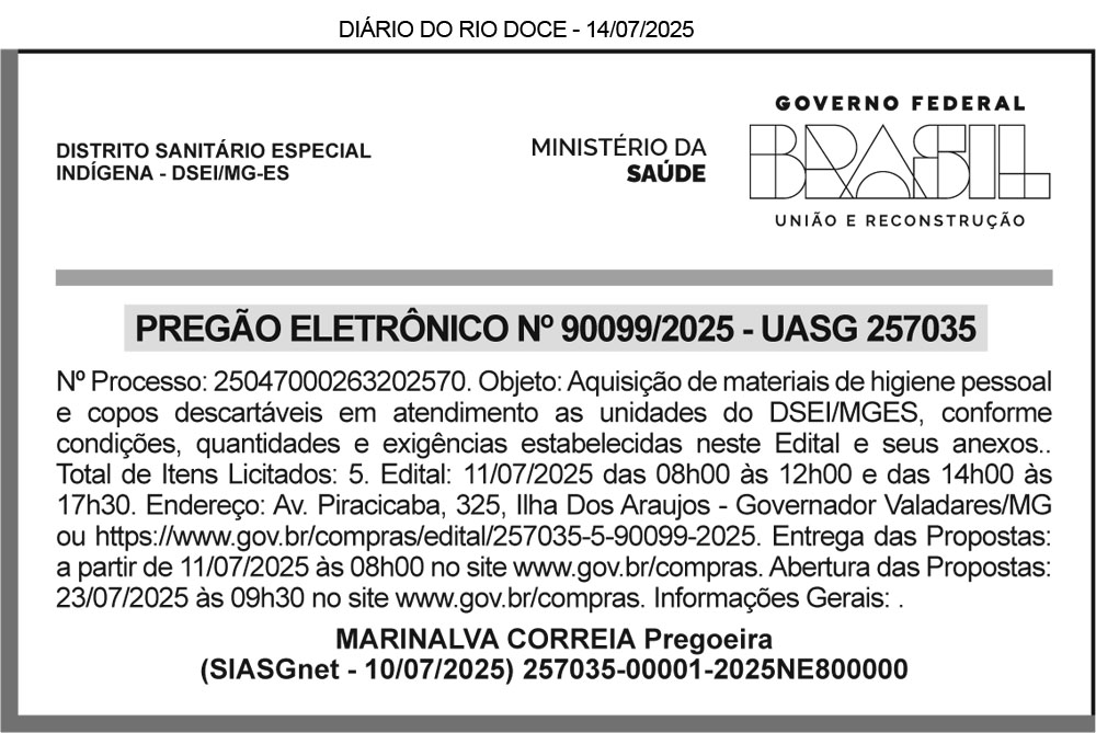 PROCESSO LICITATÓRIO Nº 89/2025 – PREGÃO ELETRÔNICO Nº 11/2025. Objeto: Registro de Preços para futura Aquisição de Material de Limpeza e Consumo para as Secretarias Municipais de Galiléia/MG. Início de Recebimento das Propostas: 02/07/2025, às 08h00min. Fim do Recebimento das Propostas: 16/07/2025, às 08h00min. Data da Sessão Eletrônica: 16/07/2025, às 09h00min. Local: BLL www.bll.org.br. Aquisição do Edital na sede da Prefeitura Municipal de Galiléia, MG, E-mail: licitacao@galileia.mg.gov.br, Site: http://galileia.mg.gov.br/licitacoes/ e Portal Nacional de Compras Públicas (PNCP). Maiores Informações na sede da Prefeitura Municipal de Galiléia-MG, pelo email: licitacao@galileia.mg.gov.br ou pelo telefone: (33) 3244-1221. Galiléia-MG, 30/06/2025. Jonatas Melo Baltar. Secretário Municipal de Administração e Governo.